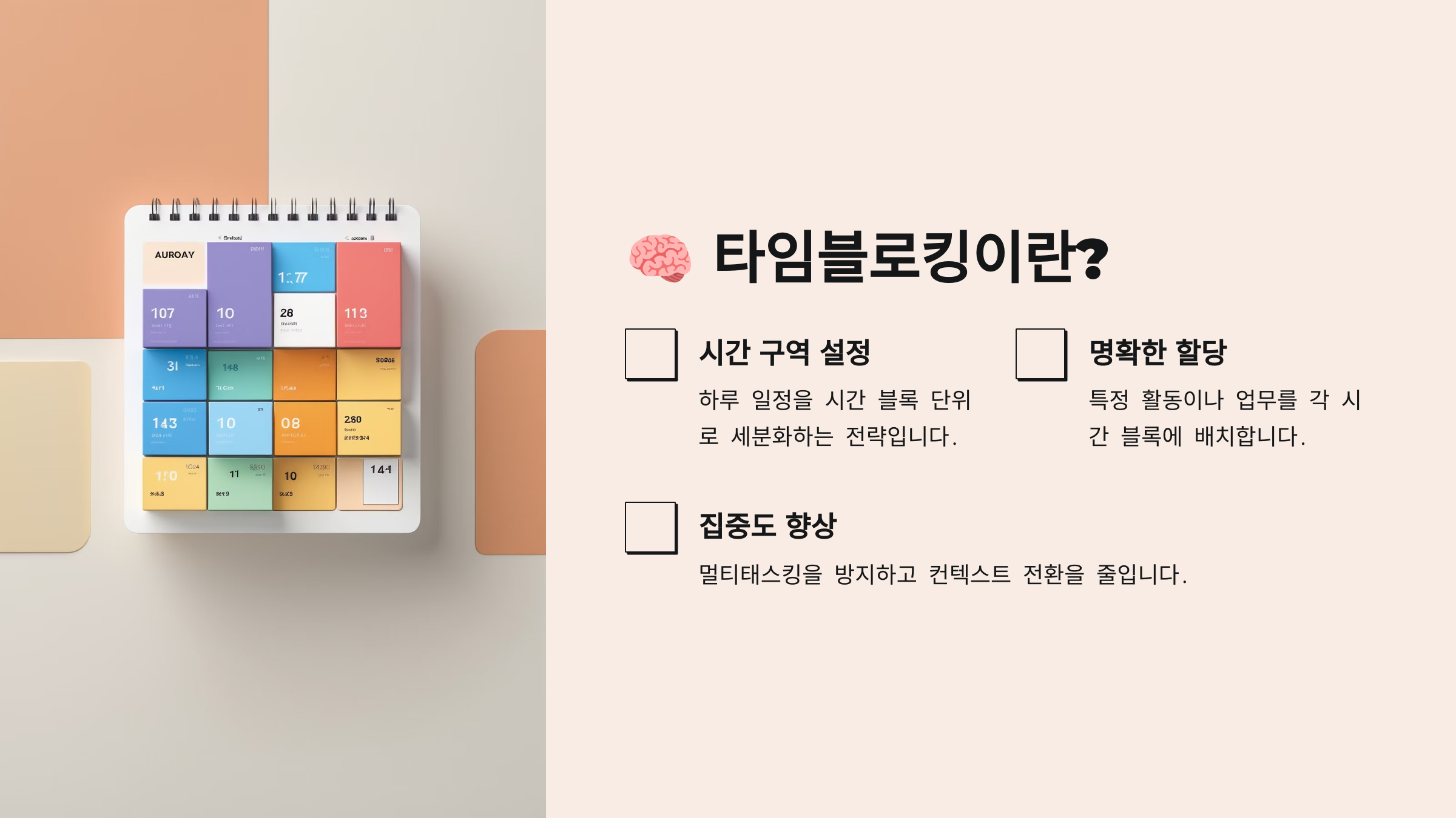 타임블로킹은 단순한 일정 관리가 아니에요. 이건 내 시간에 '의도'를 담는 습관이자 전략이에요. 시간이라는 자원을 능동적으로 쓰게 도와주는 가장 강력한 방식 중 하나예요.