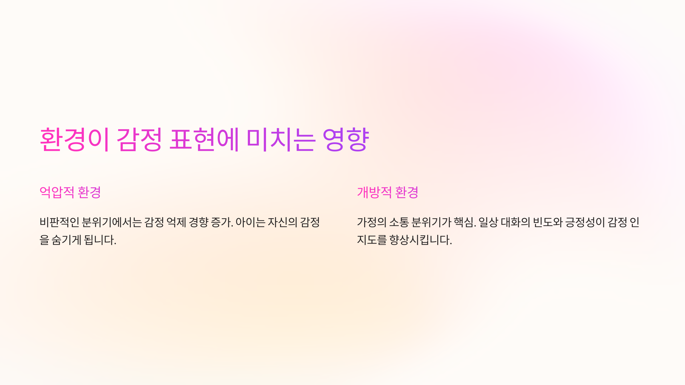 감정을 말로 표현하는 능력은 아이가 자라나는 환경과 밀접한 관련이 있어요. 아무리 감정 단어를 가르쳐줘도, 아이가 감정을 드러냈을 때 비난하거나 무시하는 분위기라면 표현할 용기를 잃게 되죠.