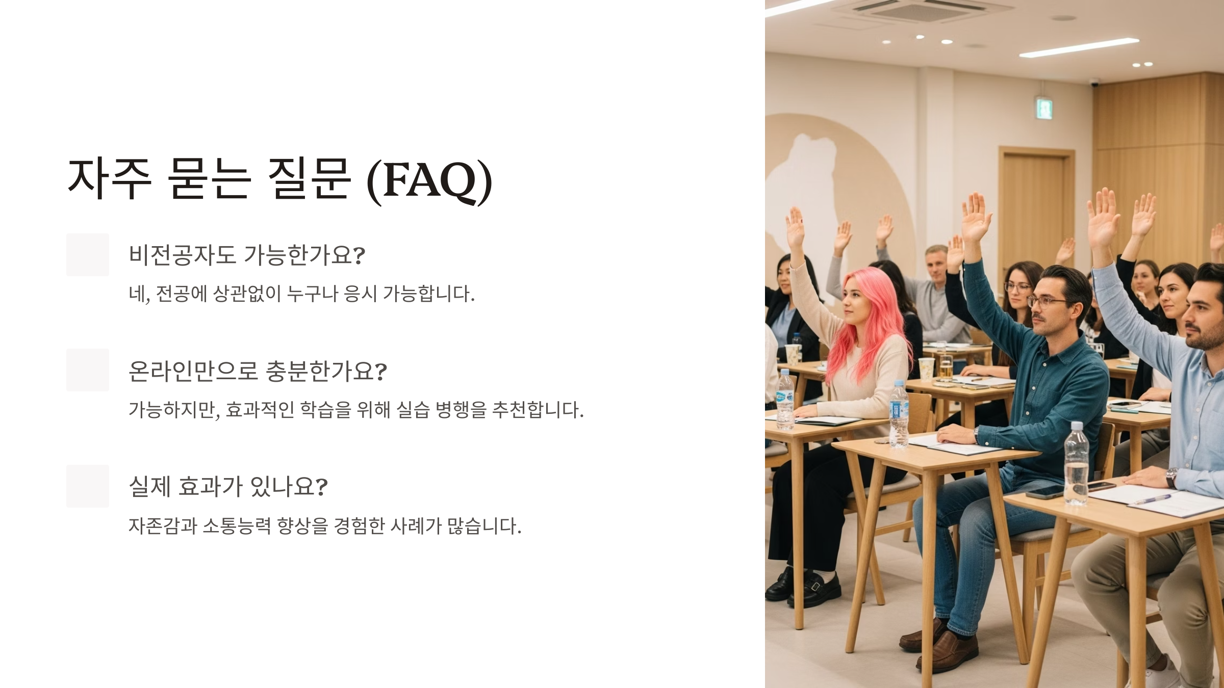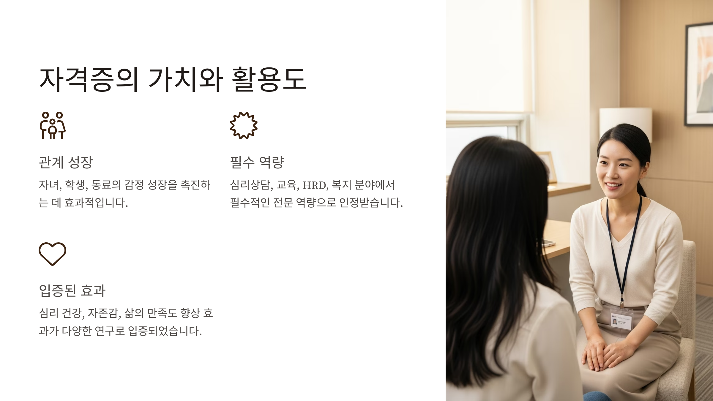 정리하자면, 이 자격증은 "지금 당장 써먹을 수 있고, 앞으로 더 유망한 자격증"이에요. 상담의 기본기부터 인간관계에 필요한 감정 표현까지 실전 기술을 알려주니, 평생 유용하게 활용될 수 있어요.