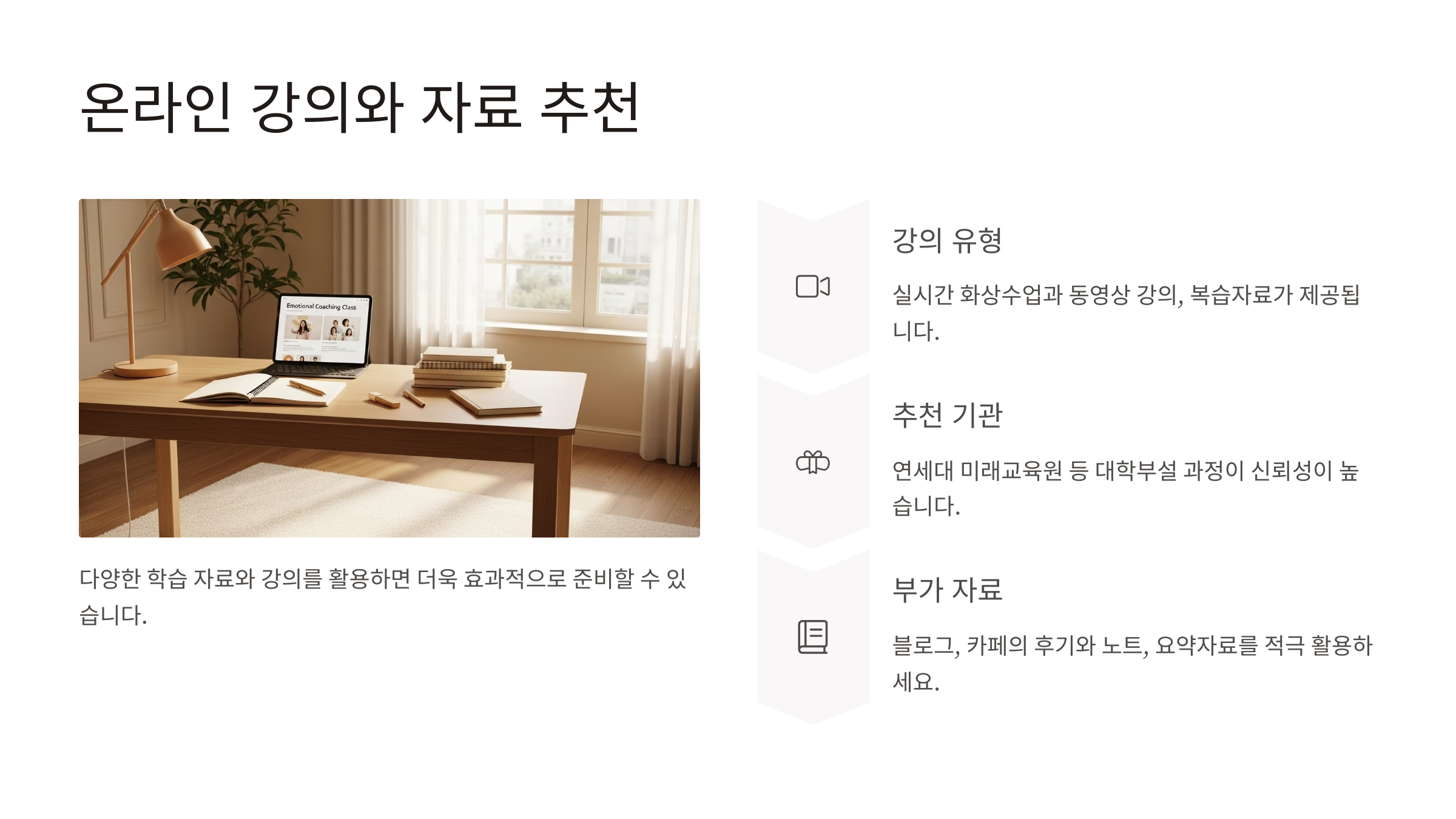 일단, 1개월 내 취득을 목표로 한다면 '집중형 온라인 과정'을 선택하는 게 핵심이에요. 감정코칭은 실습 비중이 높지만, 이론과 과제 위주로 빠르게 끝낼 수 있는 기관들이 많답니다. 인증된 교육기관 위주로 선택하는 게 좋아요.