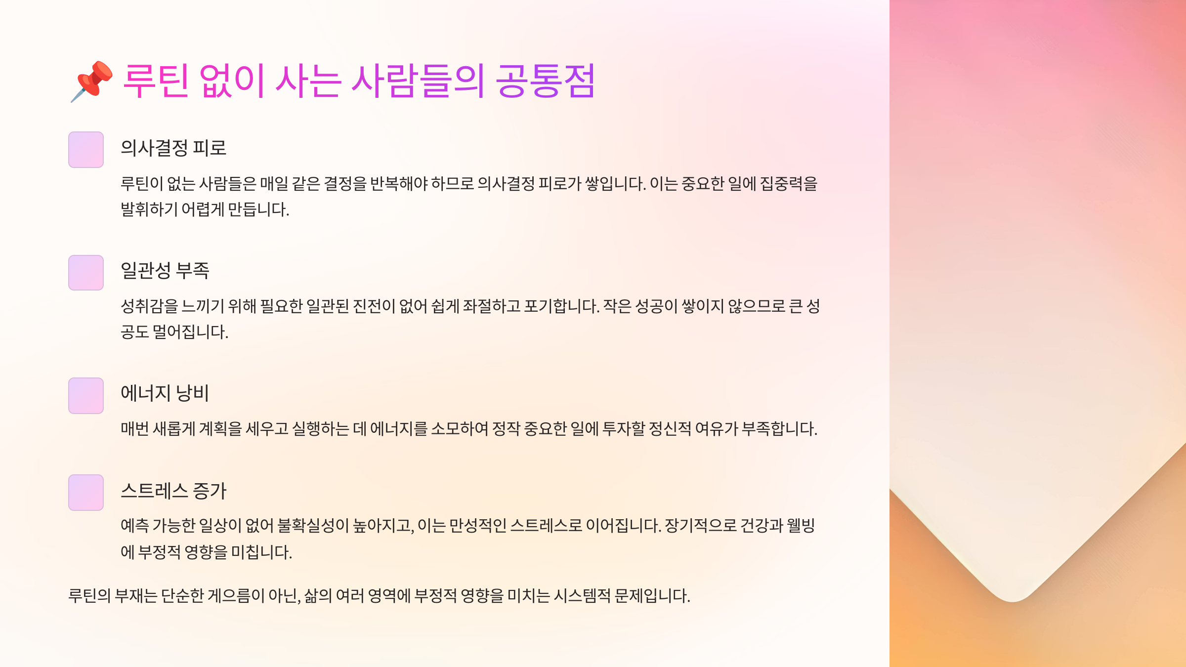 루틴 없이 사는 사람들의 하루는 즉흥적이에요. 눈을 뜨자마자 스마트폰을 확인하고, 시간이 가는 대로 움직이다 보면 어느새 하루가 끝나 있죠. 이렇게 살아가면 ‘무엇을 했는지’ 기억도 잘 안 나고, 피곤함만 쌓이게 돼요.