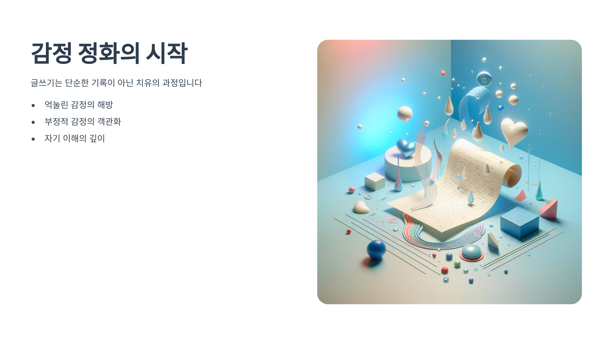 감정을 글로 쓴다는 건 단순히 단어를 나열하는 게 아니에요. 내 마음속 이야기를 종이에 옮긴다는 건 감정을 스스로 인식하고 이해하게 되는 과정이기도 해요. 사람은 감정을 인식하지 못하면 쉽게 그것에 끌려 다니게 되거든요.