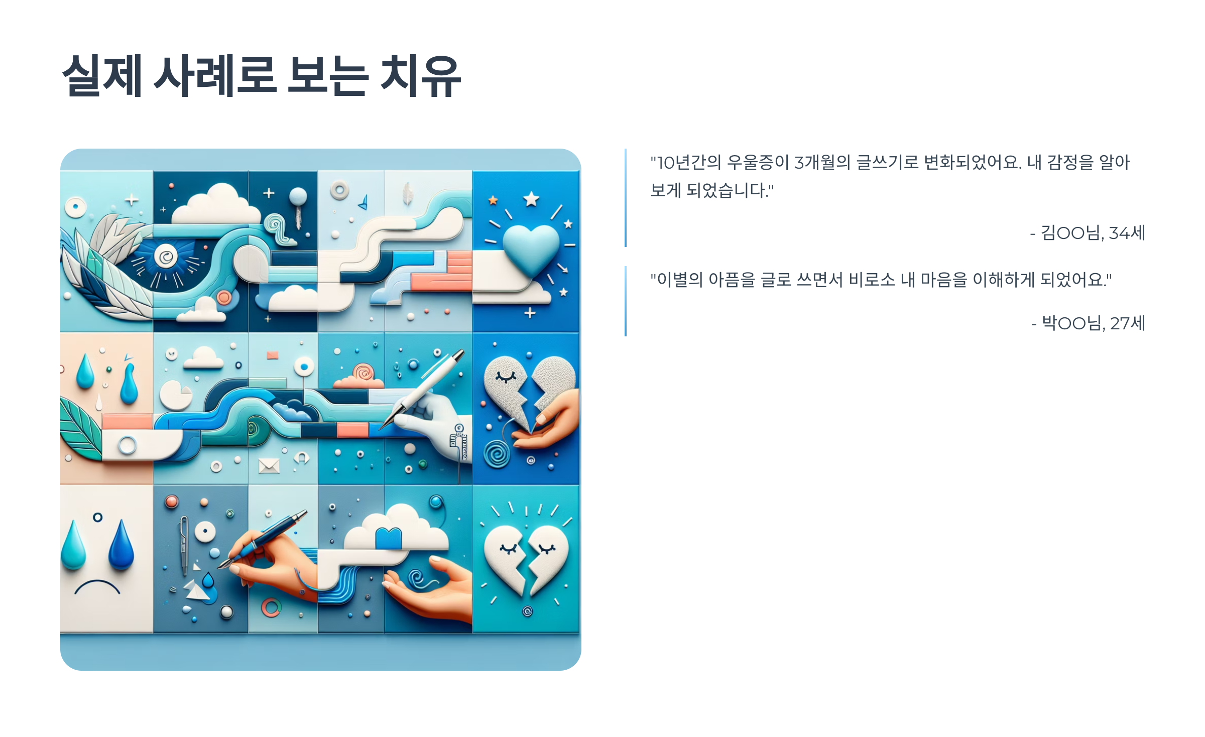 | 혜진 (40대) | 육아 스트레스, 자기감정 억눌림 | 감정 표현 → 우울감 해소 |