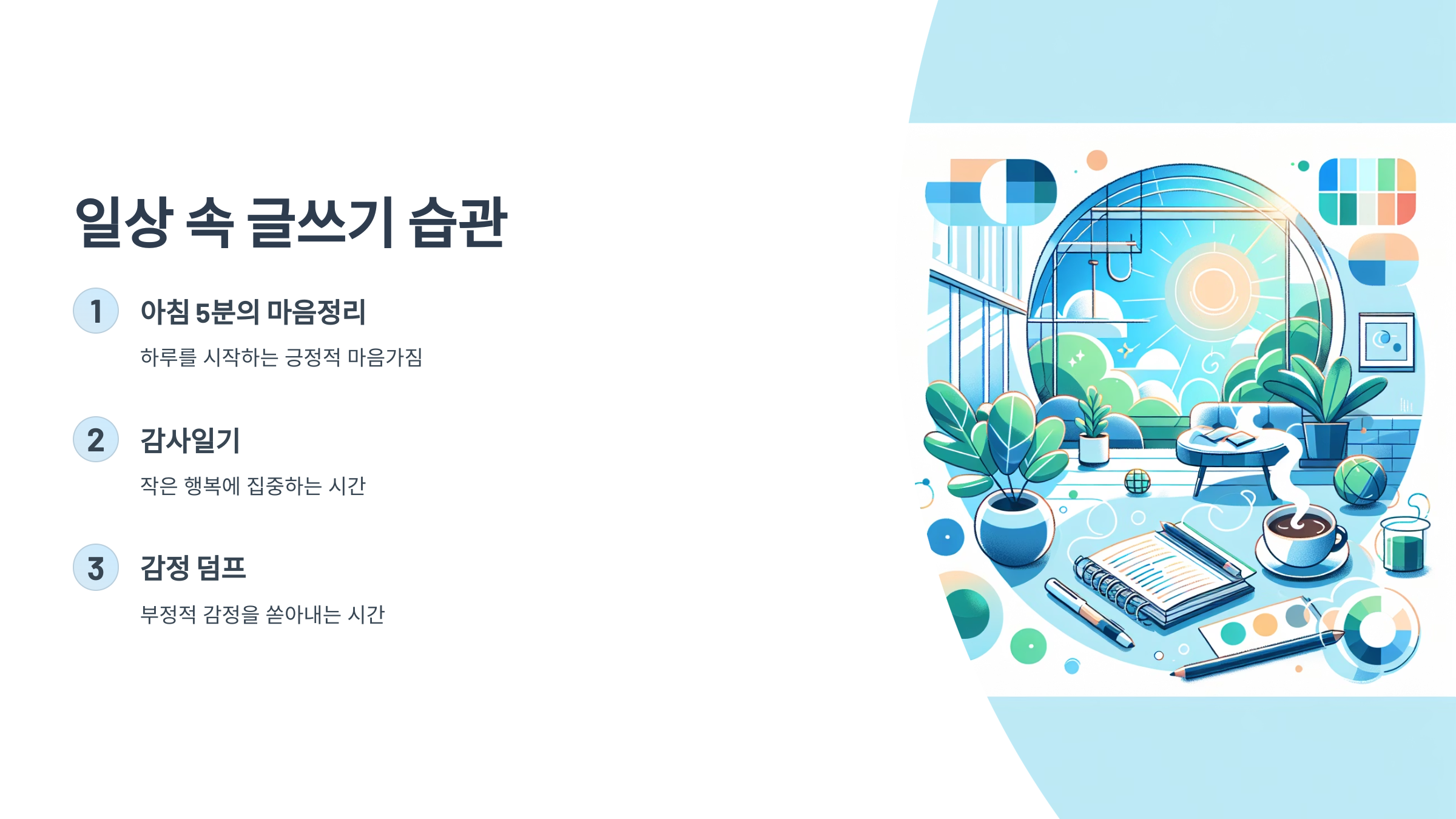 감정 글쓰기는 특별한 날에만 하는 게 아니라, 매일 조금씩 하는 게 좋아요. 매일 5분이라도 감정을 적는 습관을 만들면, 마음속 찌꺼기들이 쌓이지 않게 도와줘요. 글쓰기 습관은 곧 내 마음을 돌보는 루틴이 되는 셈이죠.