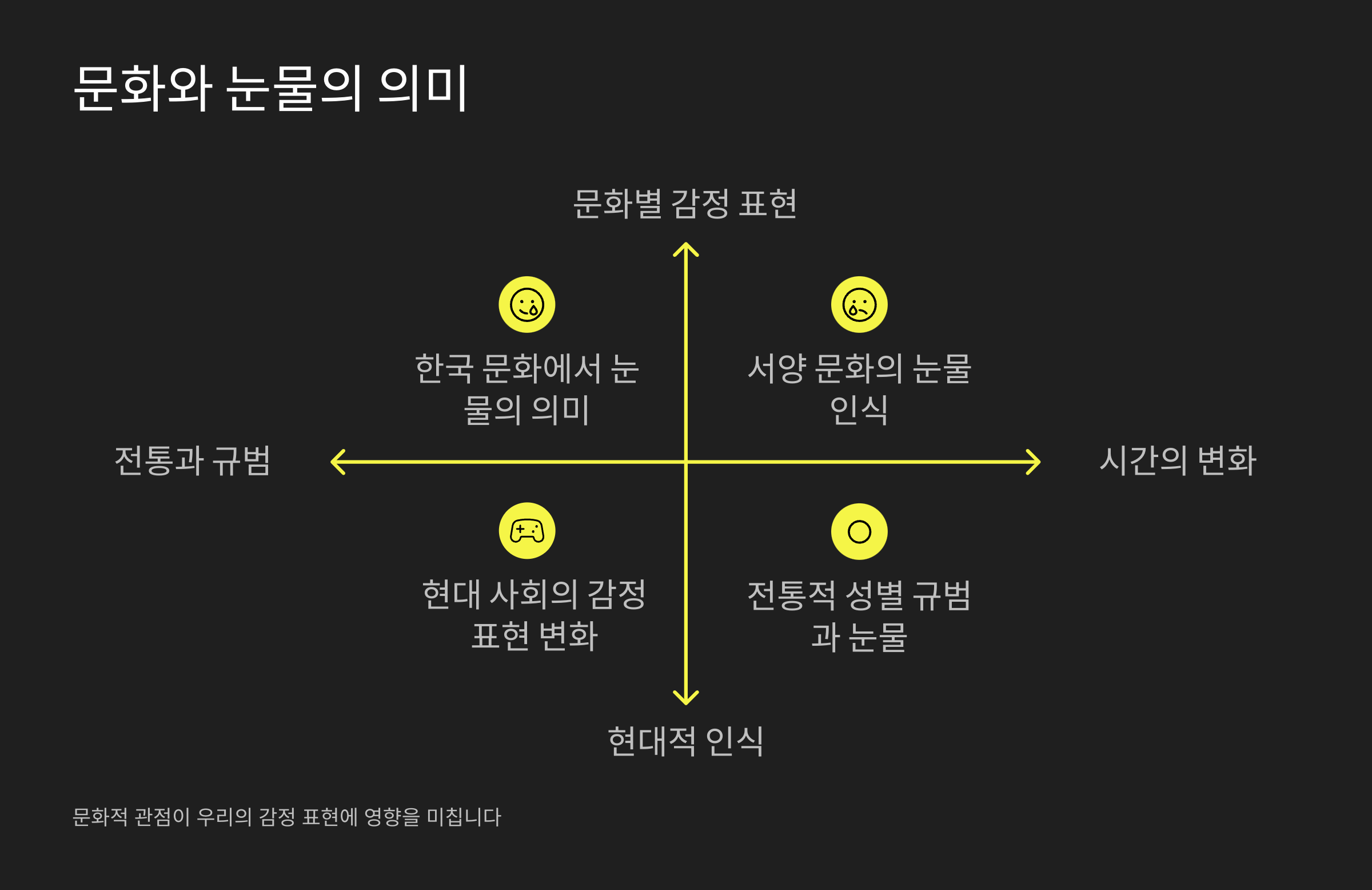 한국 사회에서도 과거에는 "남자는 울면 안 된다"는 말이 있을 정도로 눈물을 부정적으로 보는 시선이 있었어요. 하지만 요즘은 감정을 솔직하게 표현하는 것이 정서 건강에 더 이롭다는 인식이 확산되고 있답니다.