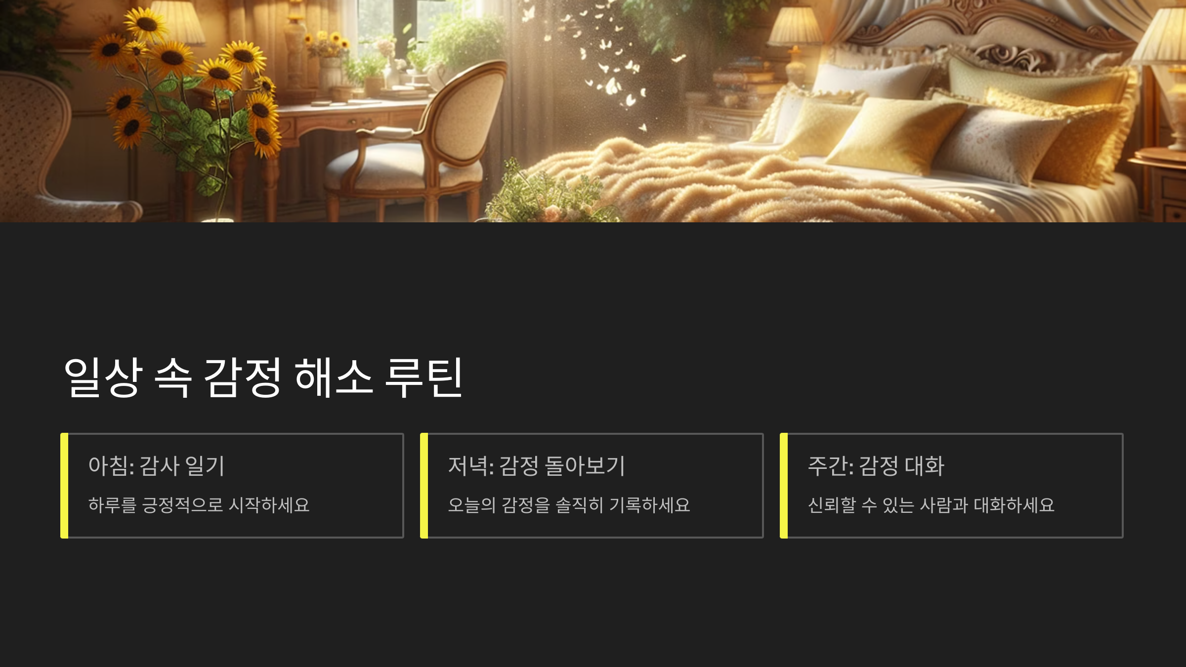감정을 해소하는 루틴은 아주 작고 사소한 일들에서 시작해요. 중요한 건 ‘매일’ 꾸준히 실천하는 거예요. 하루 1%의 감정 정리가 모여, 어느 날 큰 치유로 돌아온답니다. 🌠
