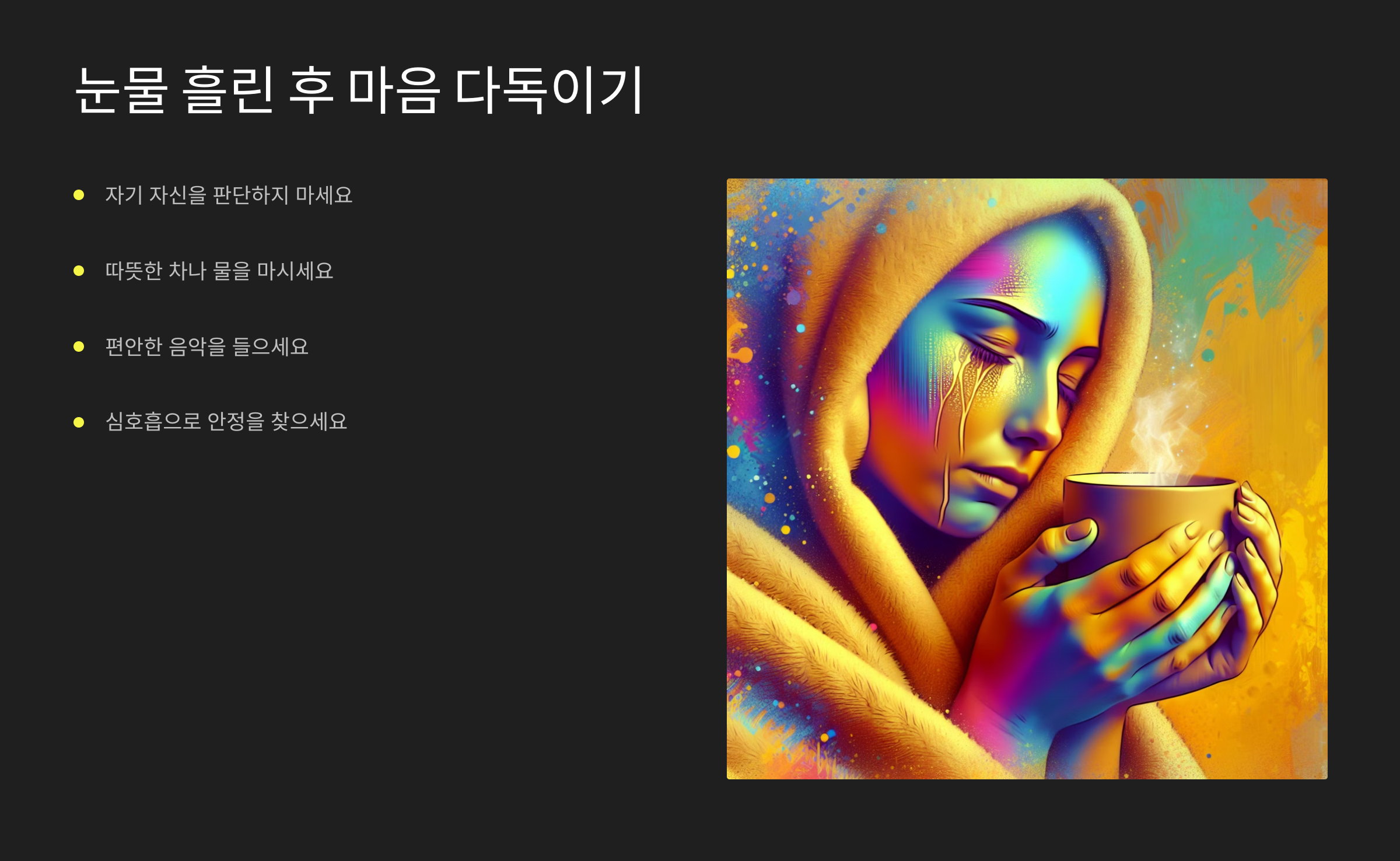눈물로 감정을 해소했다면, 스스로에게 따뜻한 말을 건네보세요. “잘했어”, “이 감정은 소중했어”, “지금의 나는 괜찮아” 같은 말 한마디가 자신을 회복시키는 힘이 돼요.