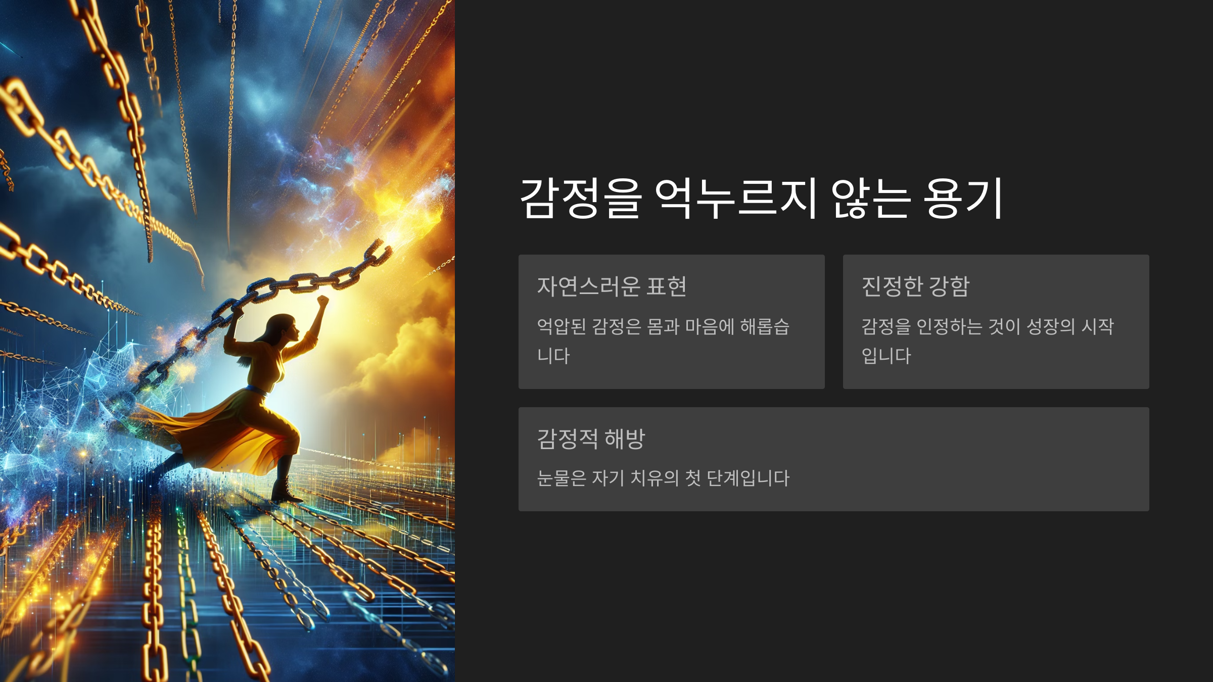 많은 사람들이 감정을 억누르는 걸 강함이라고 착각해요. 하지만 진짜 강한 사람은 자신의 감정을 직면하고, 솔직하게 받아들이는 사람이에요. 눈물은 연약함의 상징이 아니라 정직함의 상징이기도 해요.