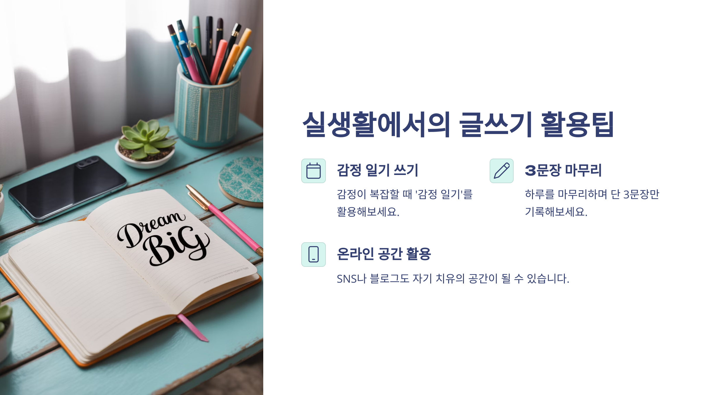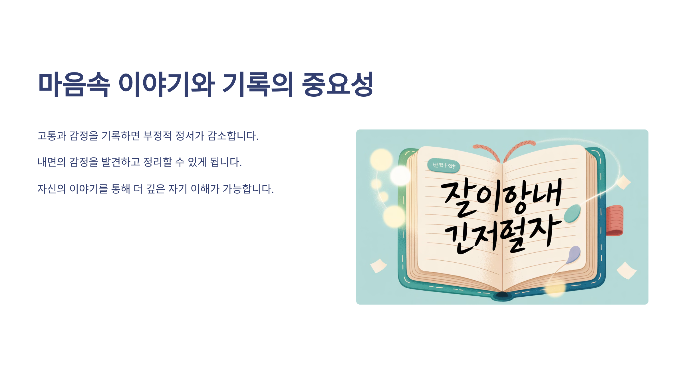 | 감정 정화 | 글을 적는 과정이 마음의 무게를 덜어줘요. |