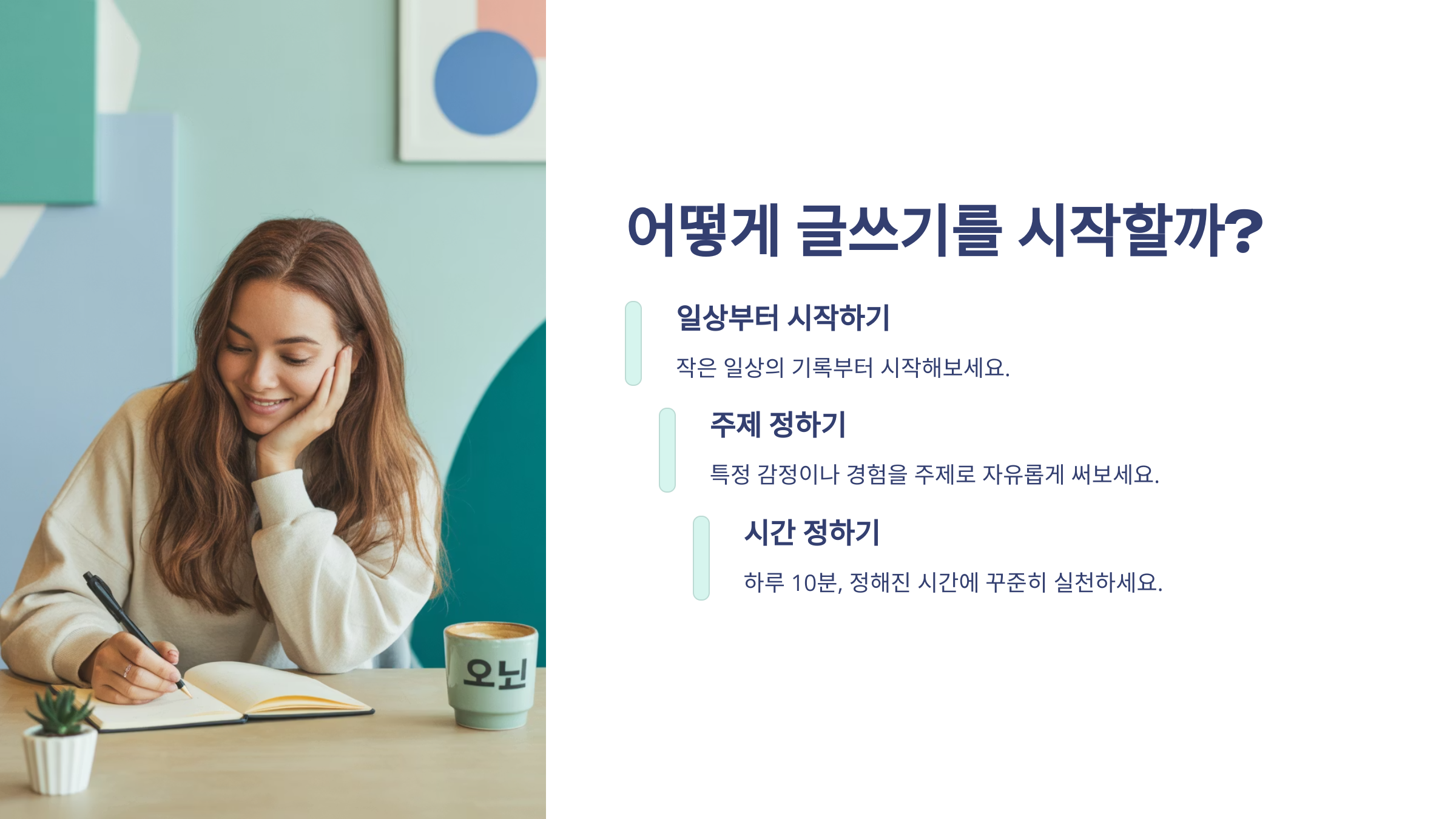 | 일상 속 기록 | 작은 노트나 메모장으로 시작해보세요. 마음을 적는 공간이 있으면 좋아요. |