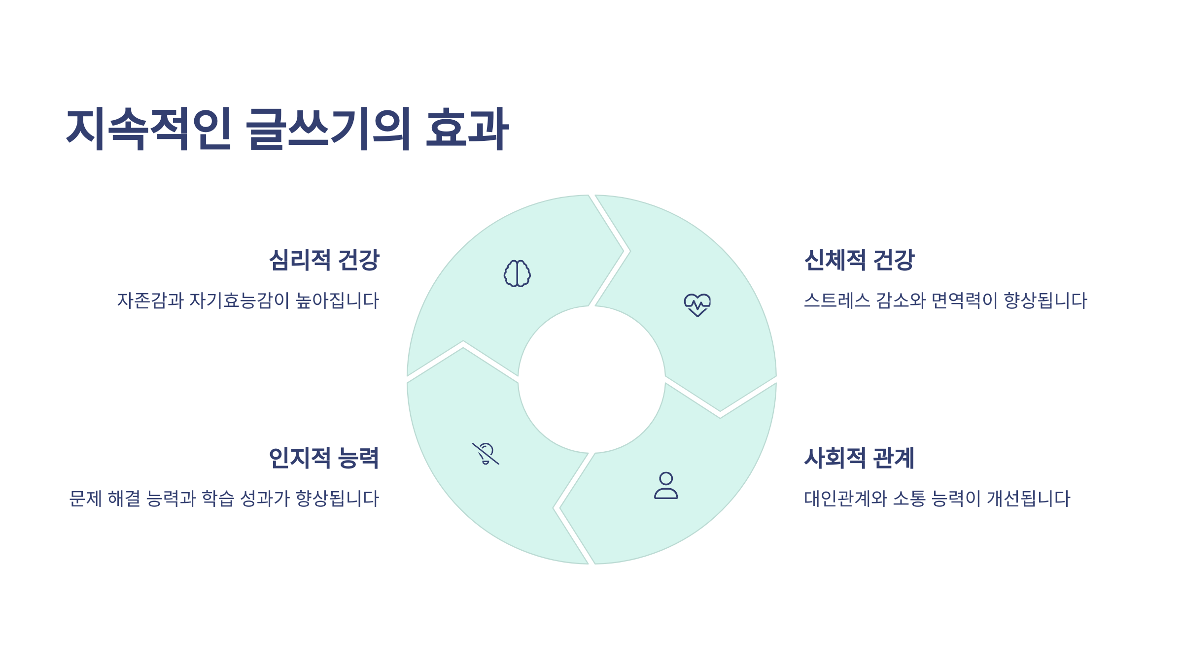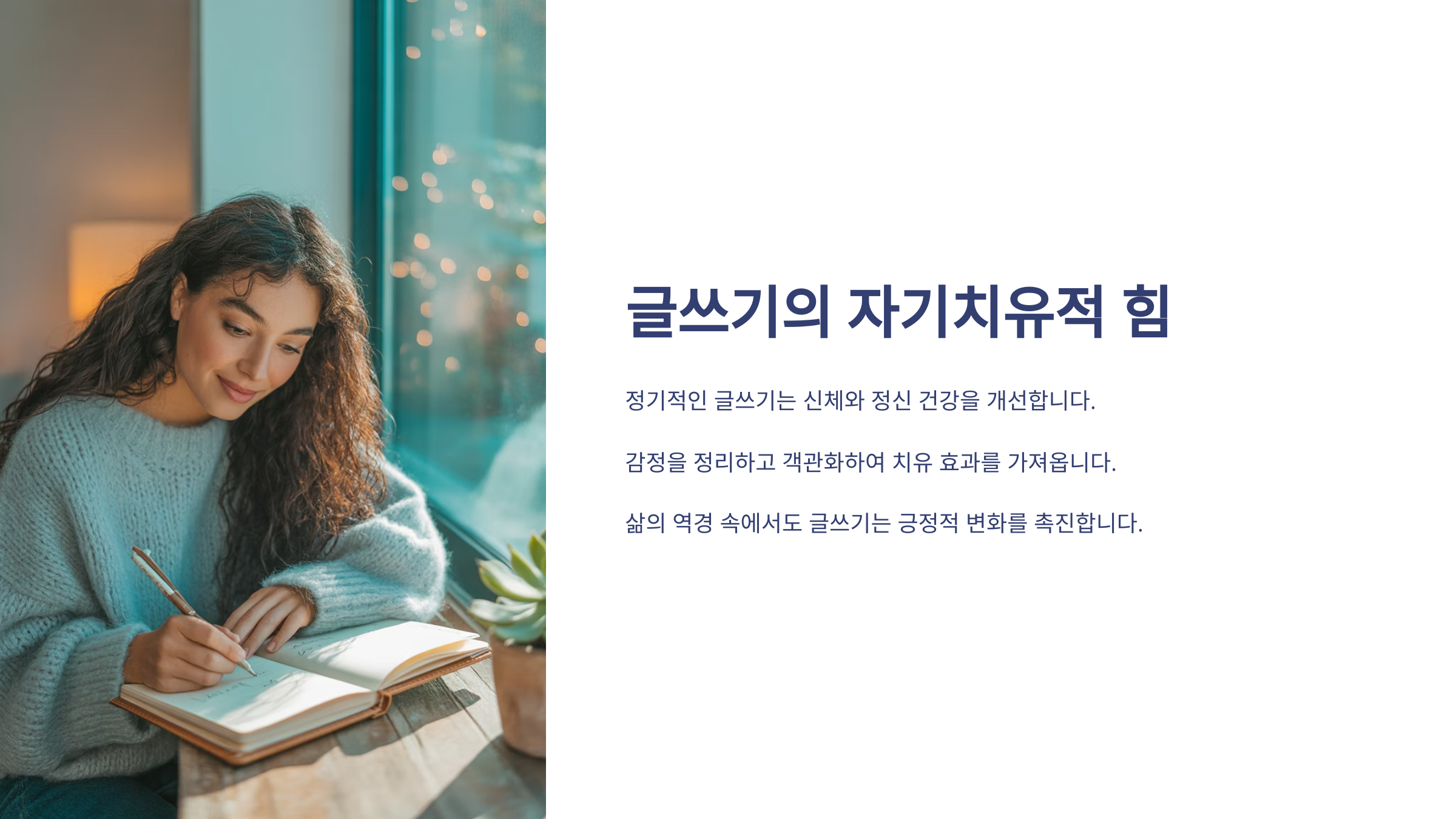 | 심리적 안정 | 글쓰기 과정에서 스스로를 위로하고, 심리적으로 안정을 찾을 수 있어요. |