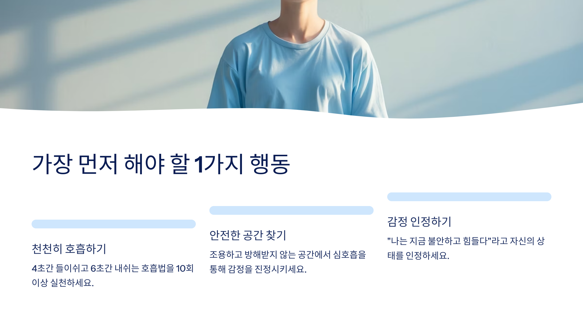 멘탈이 무너졌을 때 가장 먼저 해야 할 행동은 ‘호흡을 조절하는 것’이에요. 숨을 들이마시고 천천히 내쉬는 행위는 단순해 보여도, 뇌에 직접적으로 안정 신호를 보내는 가장 효과적인 방법이에요.