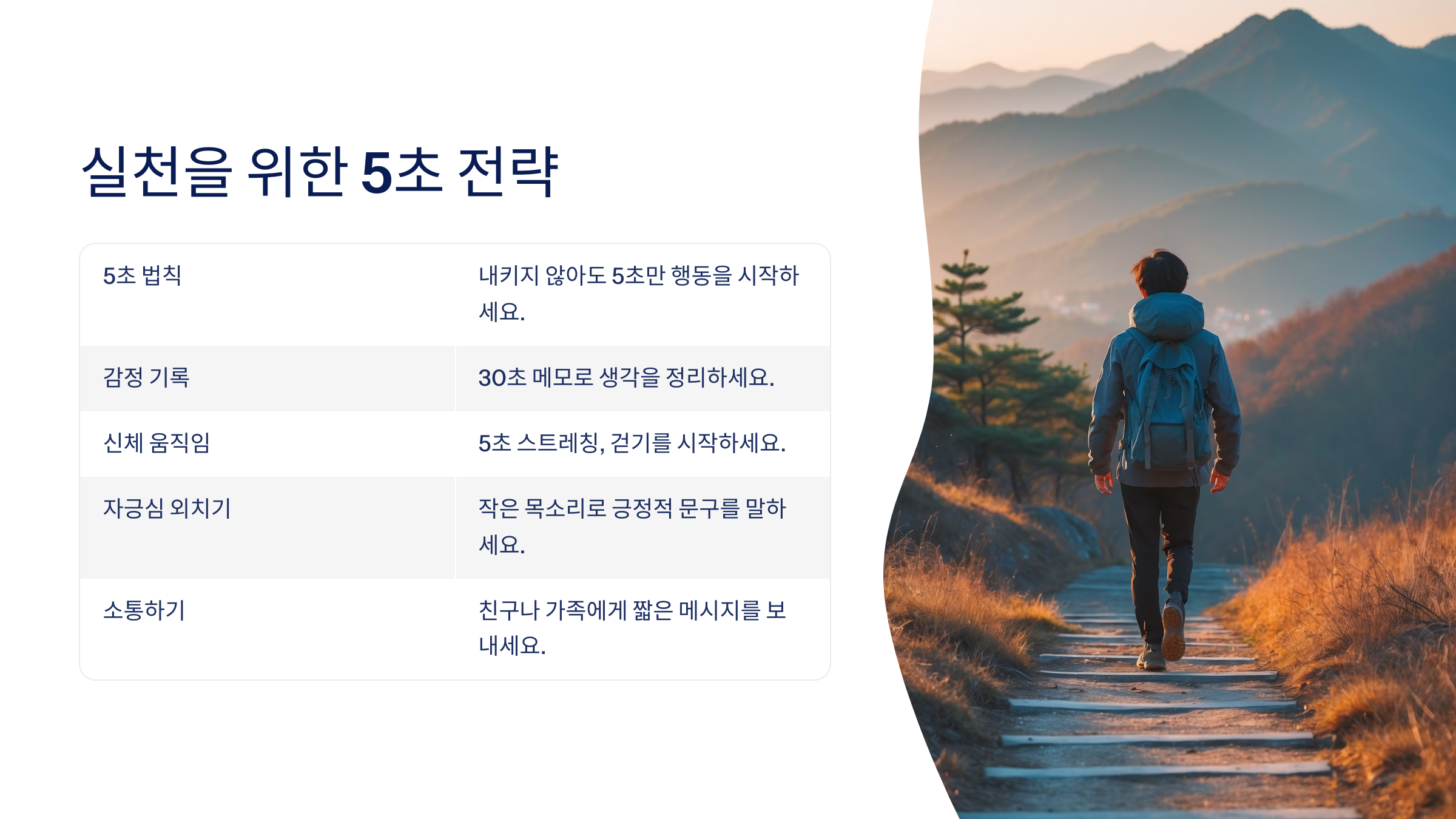 이 모든 내용을 실천으로 옮기기 위한 가장 현실적인 전략은 ‘5초 규칙’이에요. 유명 심리 코치 멜 로빈스가 제시한 방법으로, 생각이 지나치게 굳기 전에 행동으로 옮기는 방법이에요.