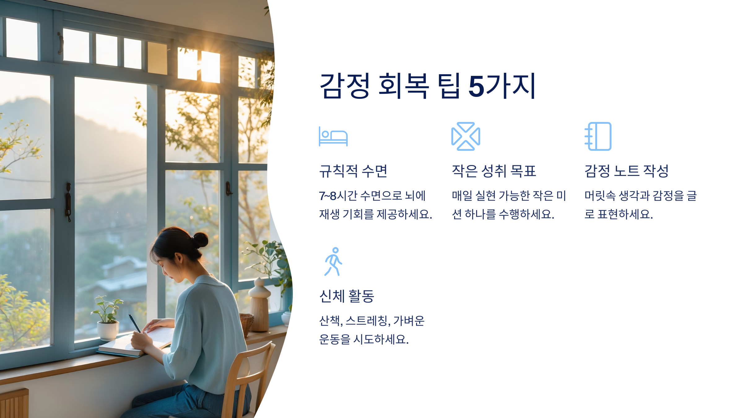 멘탈이 무너진 순간, 한 번의 호흡 이후 어떻게 회복을 이어가야 할지 막막할 수 있어요. 그래서 정리해봤어요. 간단하지만 실제로 효과가 입증된 감정 회복 팁 5가지예요.