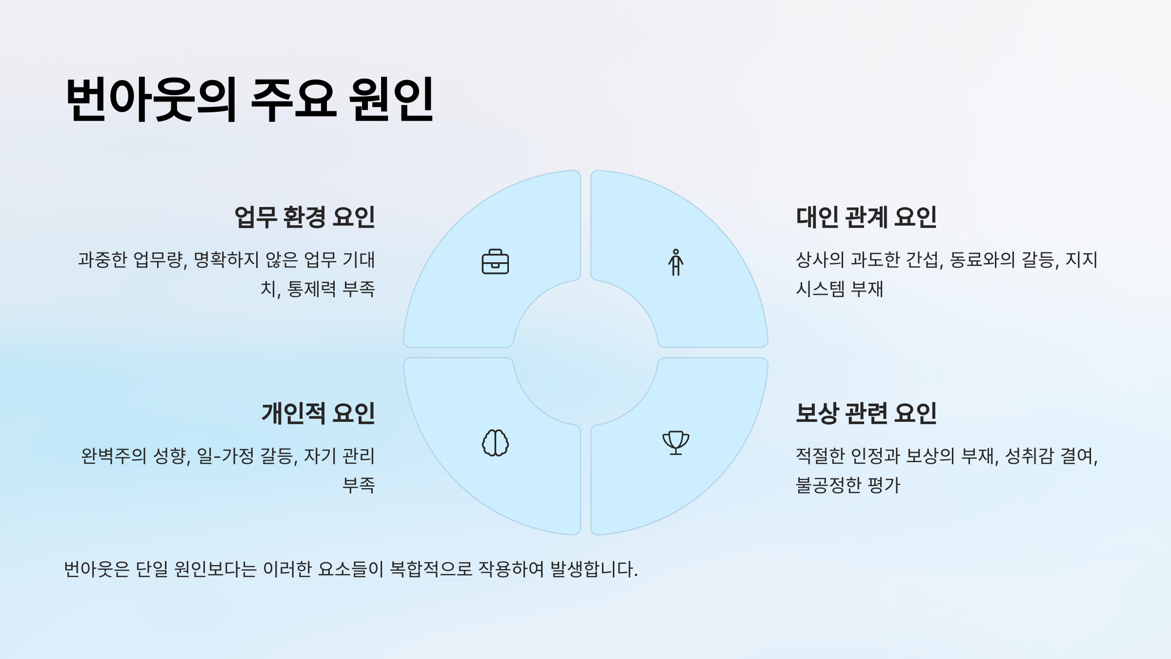 이처럼 번아웃은 단일 원인이 아니라, 다양한 환경과 감정, 생각의 복합 작용으로 나타나요. 그렇기 때문에 원인을 하나씩 줄여가는 노력이 필요하답니다. 그게 바로 회복의 시작이에요. 😊