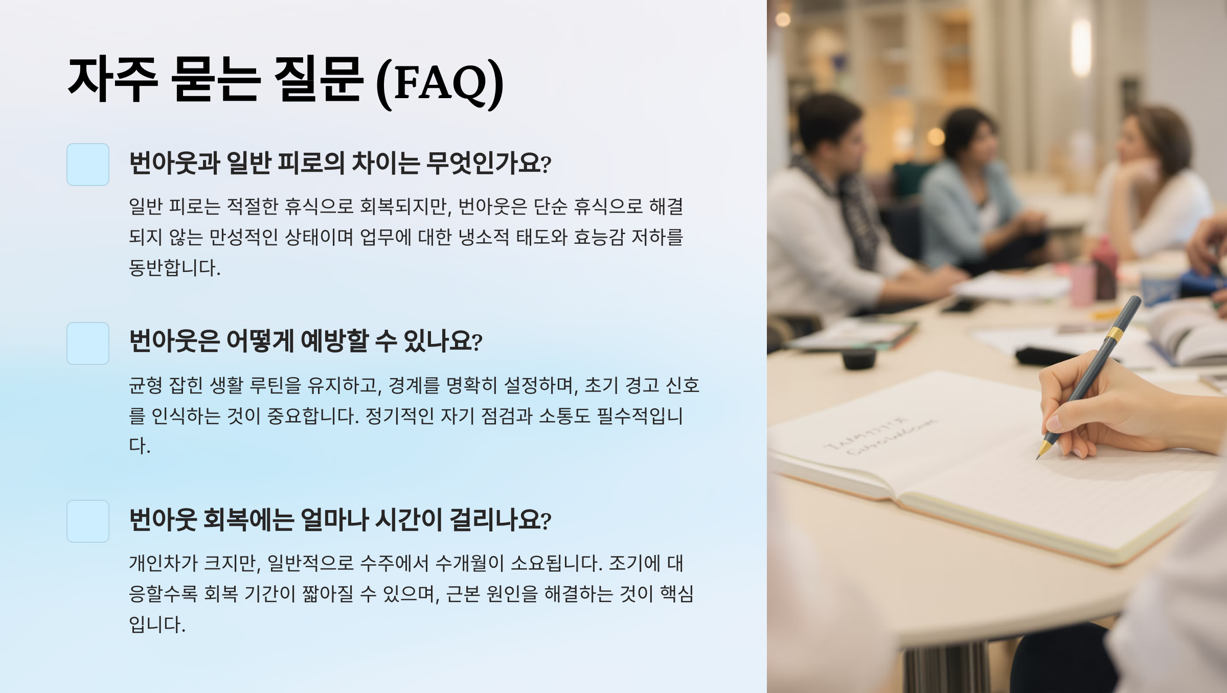A7. 퇴사는 일시적인 해결이 될 수 있지만, 근본 원인을 해결하지 않으면 새로운 환경에서도 번아웃은 반복될 수 있어요. 자신의 감정, 가치, 루틴을 점검하는 것이 우선이에요.