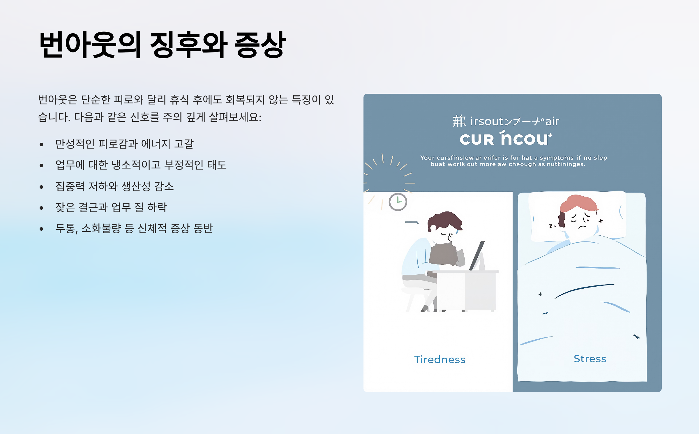 그 외에도 ‘업무에 대한 냉소적 태도’가 대표적인 징후로 나타나요. 예전엔 소중하던 일에 관심이 사라지고, “이건 어차피 안 돼”라는 식의 부정적인 생각이 자리를 잡아요.