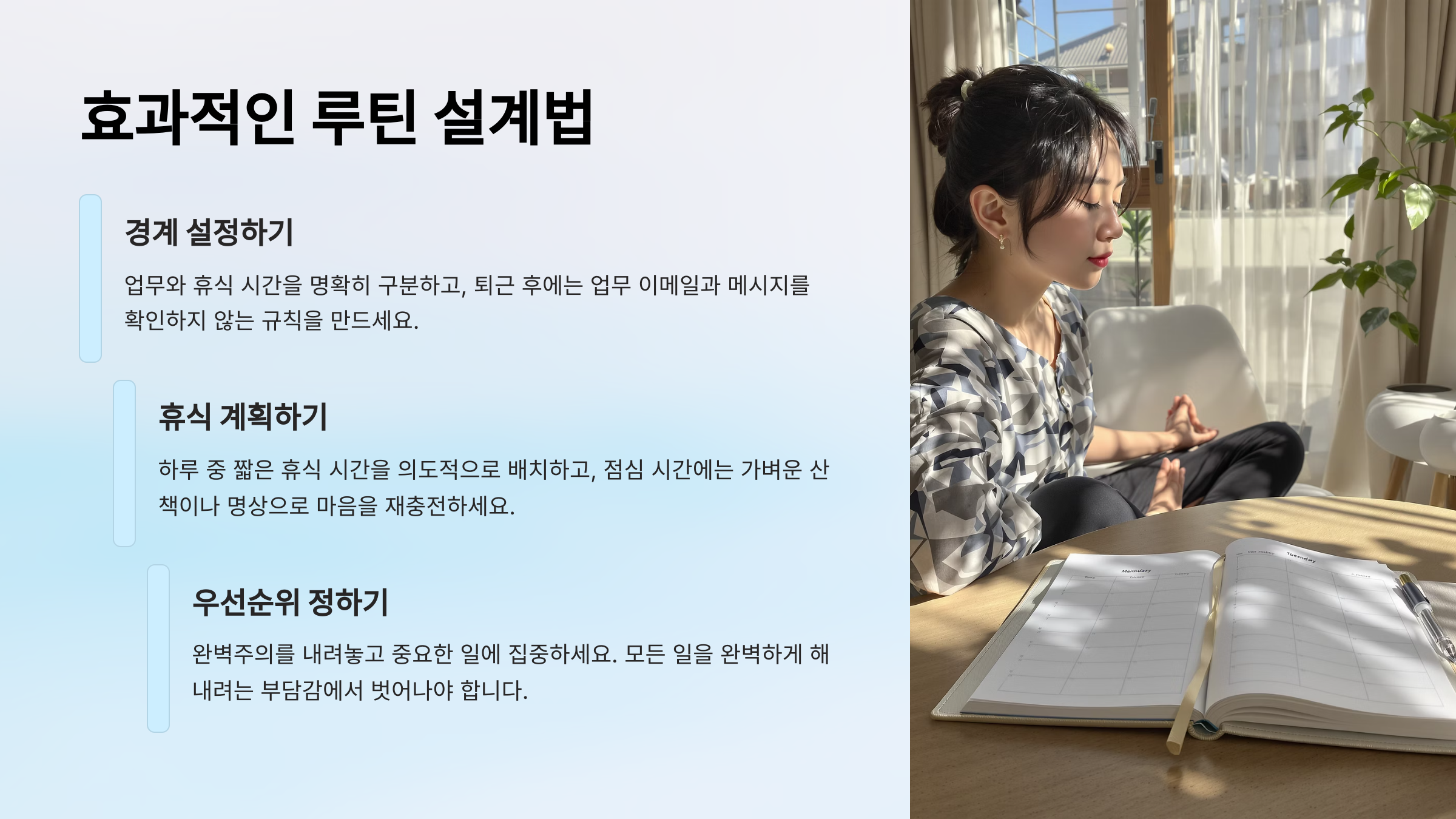 번아웃에서 벗어나려면 일상의 루틴을 '회복 중심'으로 재설계해야 해요. 단순히 일을 줄이는 게 아니라, 나의 에너지 흐름과 집중력을 고려한 구조적인 루틴이 필요하답니다. 📅