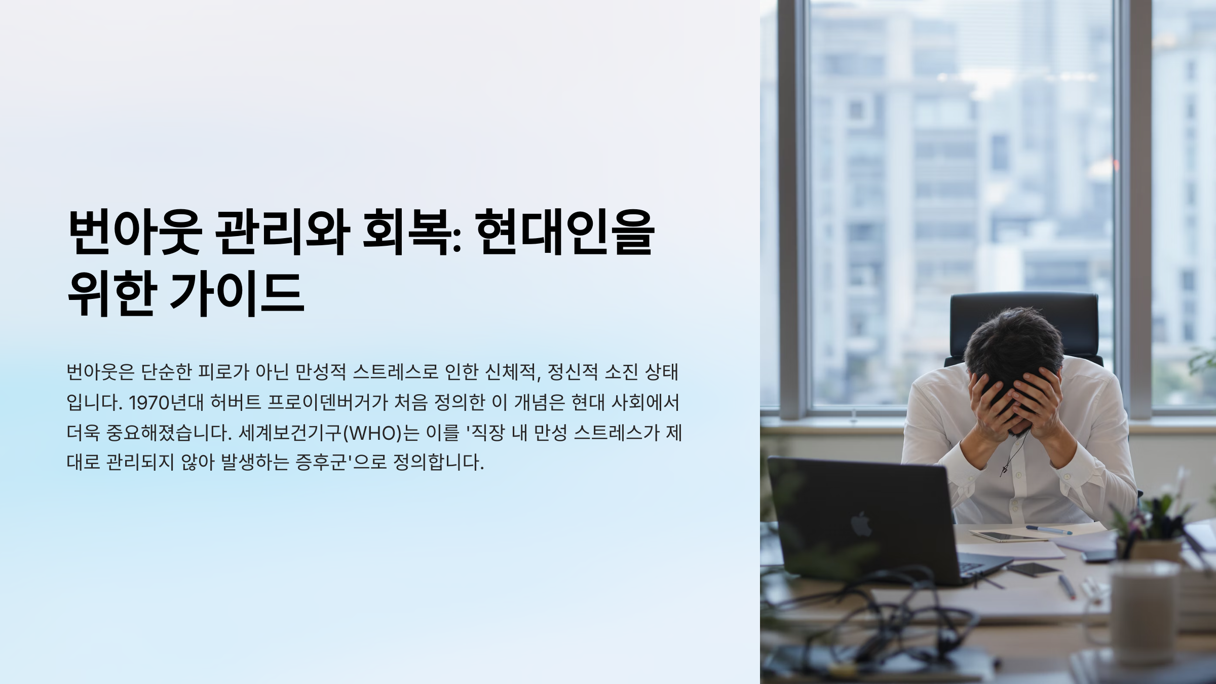 세계보건기구(WHO)는 번아웃을 '성공적으로 관리되지 않은 만성적인 직장 스트레스로 인한 증후군'으로 정의했어요. 즉, 업무에만 국한되지 않고 일상에서도 쉽게 나타날 수 있는 정신적 현상이라는 거죠.
