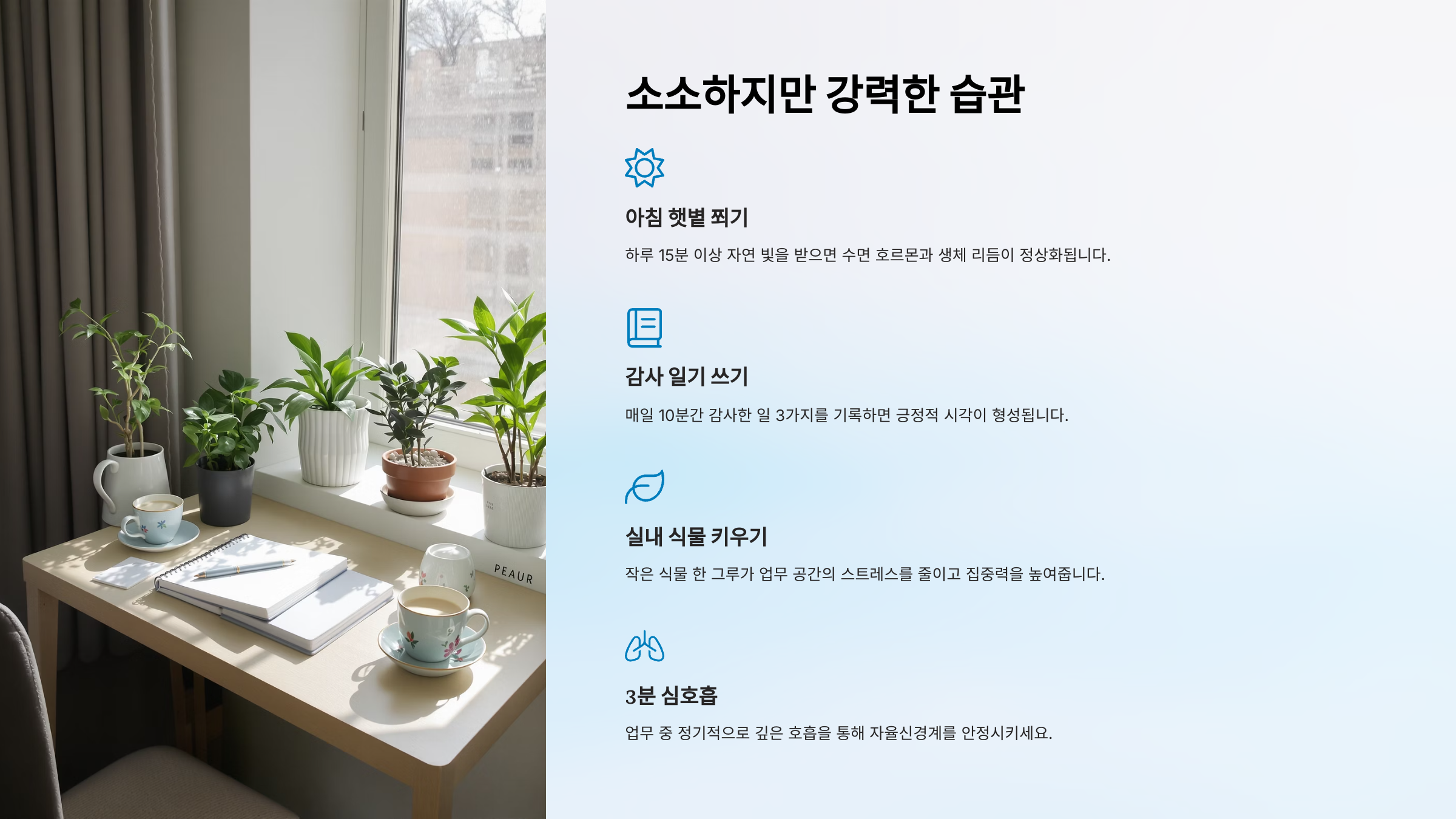 번아웃을 예방하고 삶의 균형을 유지하는 데 있어 중요한 건 거창한 변화보다 일상 속 작고 꾸준한 습관들이에요. 습관은 우리 삶의 방향을 자연스럽게 바꾸는 힘을 가지고 있거든요. 😊