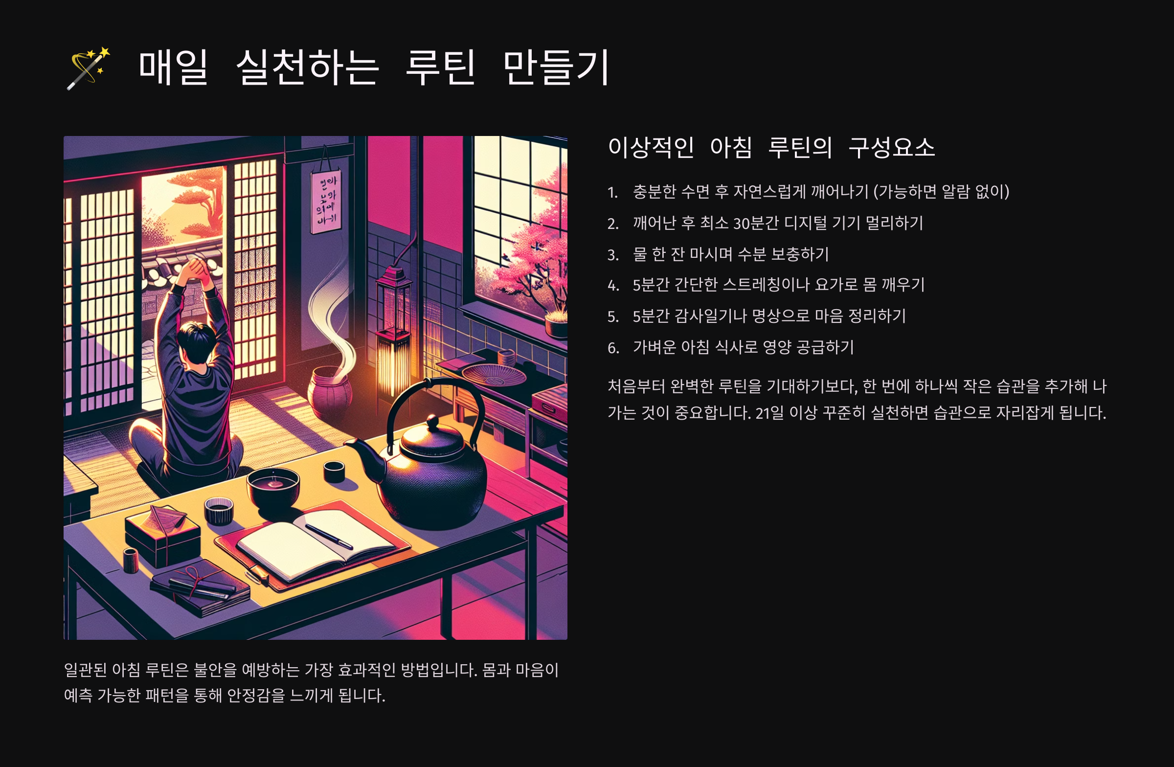 루틴은 의지가 아니라 '구조'로 만드는 거예요. 구조가 만들어지면 습관이 되고, 습관은 감정을 바꿔줘요. 하루 아침엔 어렵지만, 매일 조금씩 반복되면 반드시 변화는 찾아와요. ✨