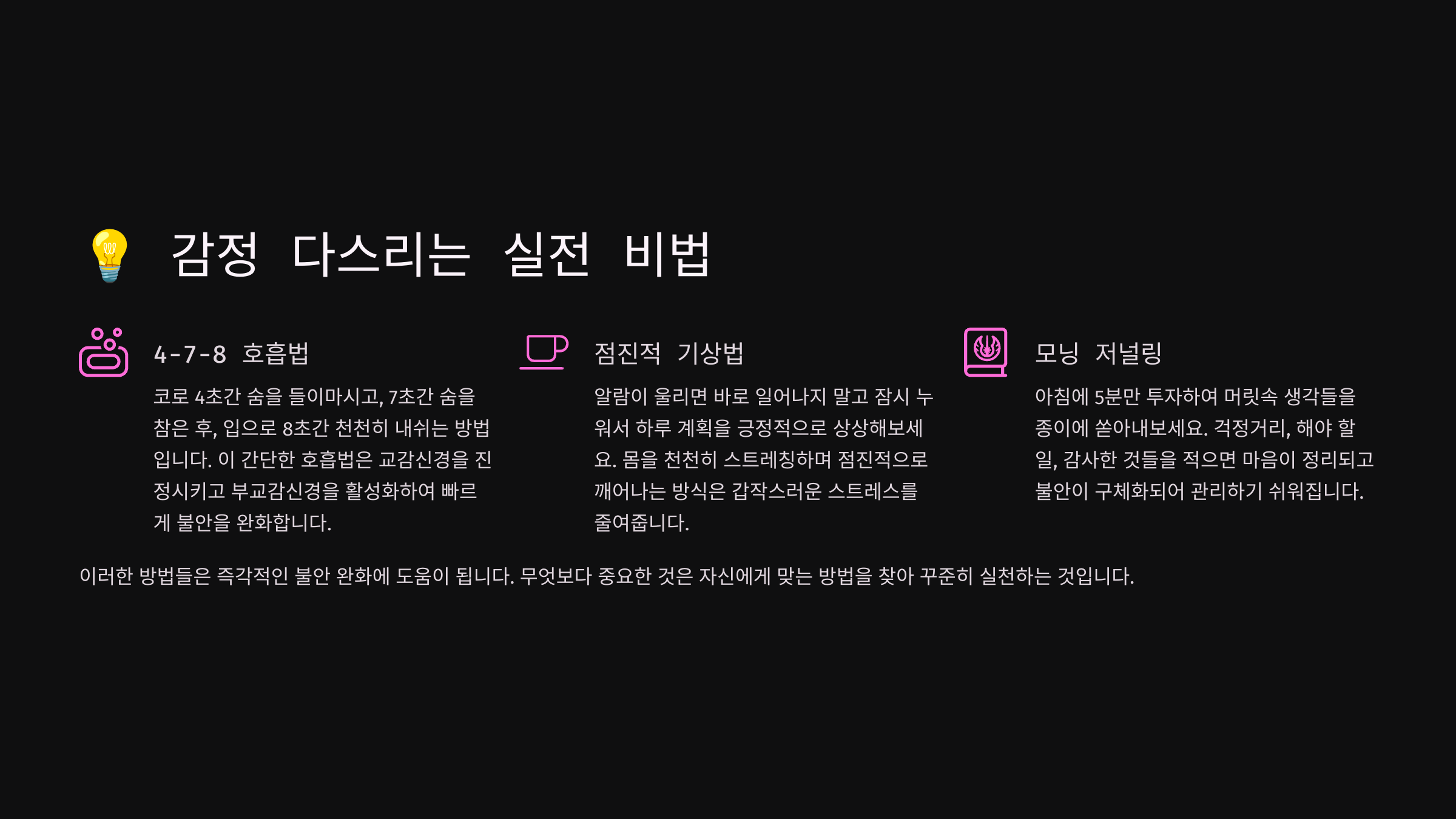 이제 아침 불안의 정체와 그 원인, 습관까지 알게 되었으니 진짜 중요한 단계에요. 바로, 감정을 안정시키고 아침을 평온하게 시작할 수 있는 실전 비법들이에요!