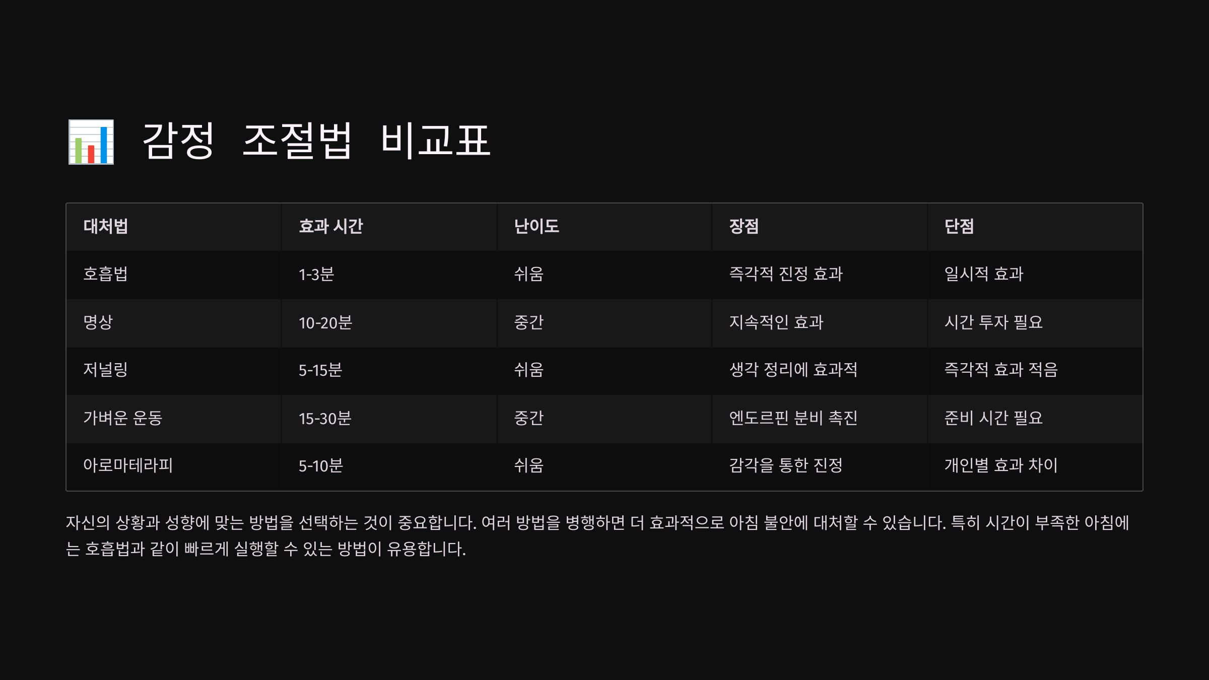 이 표에서는 각 조절법의 시간, 도구 필요 여부, 장소 제약, 실천 난이도, 기대 효과를 비교해봤어요. 지금 내 상황에 맞는 것을 골라보면 좋겠죠?