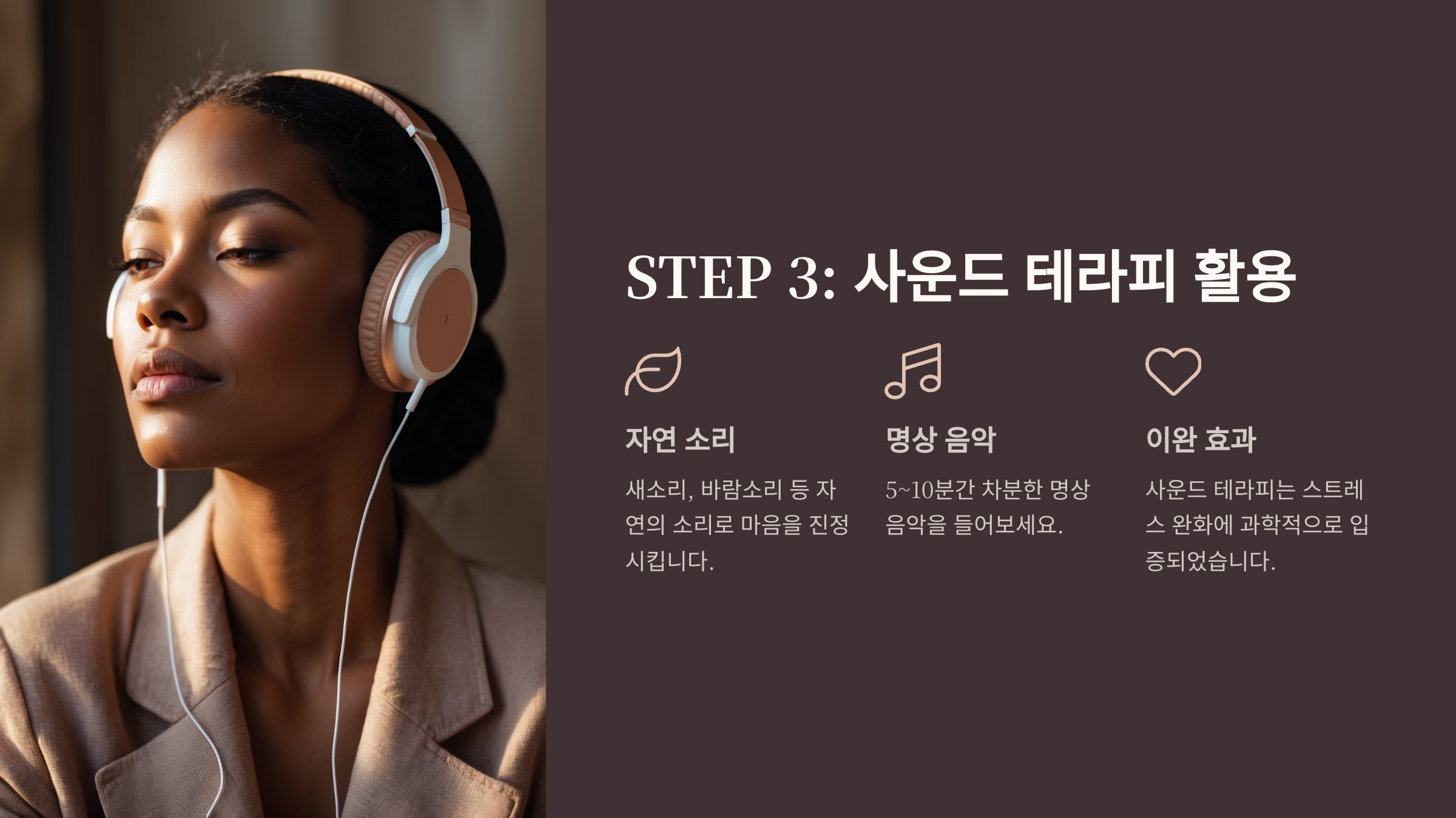 사운드 테라피는 소리를 이용해 뇌파를 안정시키고, 감정 에너지를 조절하는 방법이에요. 특히 아침에는 베타파에서 알파파로 전환되도록 유도하는 음악이 좋아요.