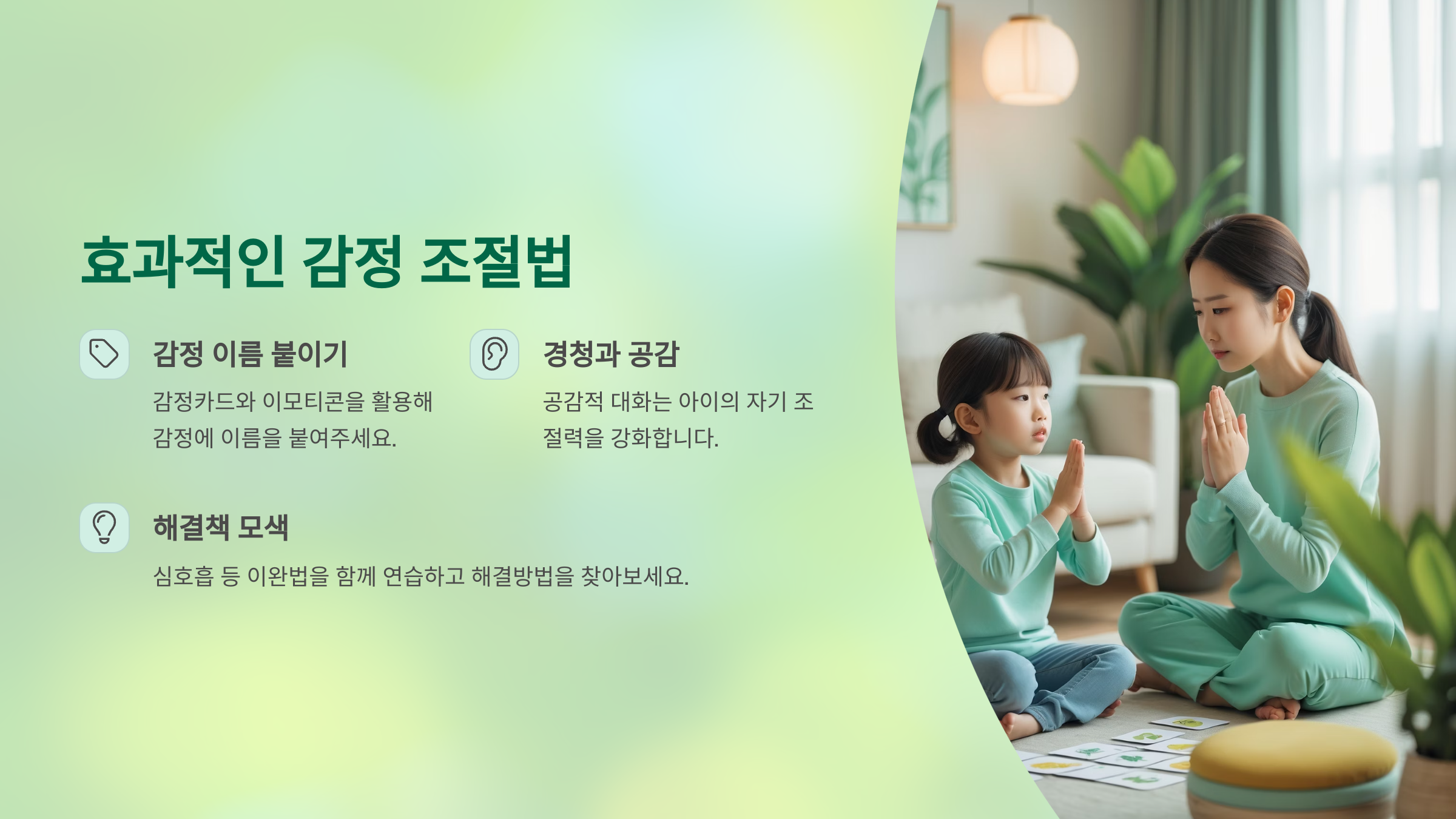 이런 방법들은 아이가 부모의 부정적 감정으로부터 상처받지 않고, 오히려 부모의 사랑을 느끼게 해줘요. 그리고 아이의 자존감과 안정감 형성에도 큰 도움이 된답니다. 💛