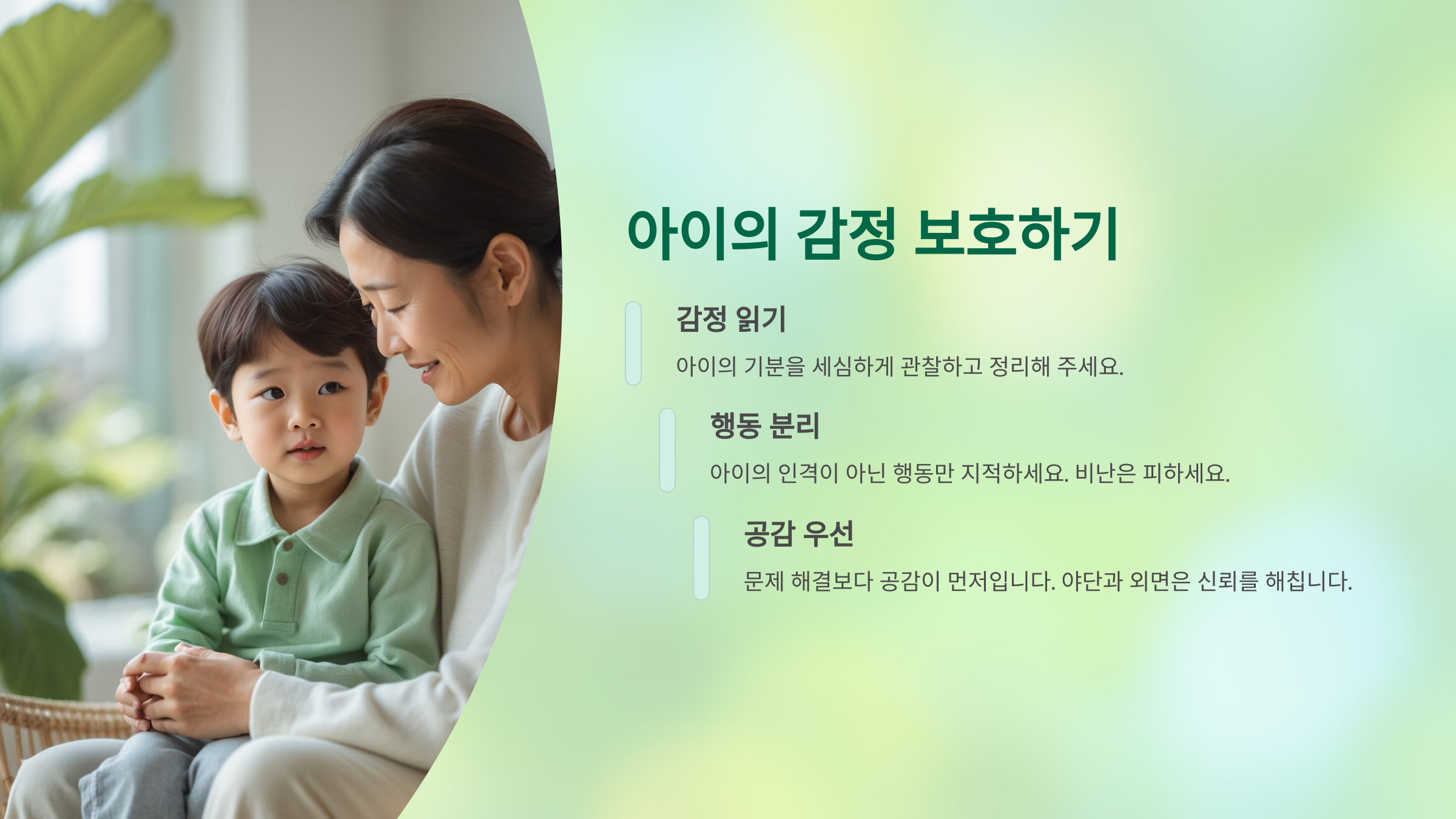아이의 감정을 보호하려면 부모가 감정의 파도를 먼저 잠시 멈춰야 해요. 눈을 맞추고 부드럽게 말하려 노력해보세요. "엄마도 지금 화가 나지만 너를 미워하는 건 아니야"라고 말해주면, 아이는 부모의 감정이 자기 때문이 아님을 알게 돼요.