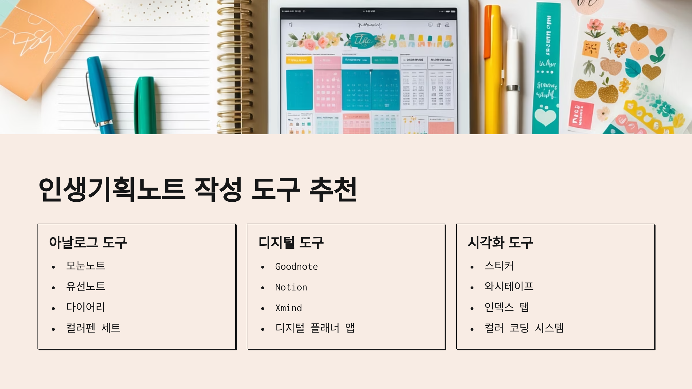 내가 생각했을 때 가장 중요한 건 ‘꾸준히 적을 수 있는 도구’예요. 어떤 도구를 쓰더라도 나에게 맞고, 내가 잘 쓸 수 있는 게 최고랍니다. 목표를 적는 순간부터 작은 기적이 시작된다는 걸 기억해보세요!