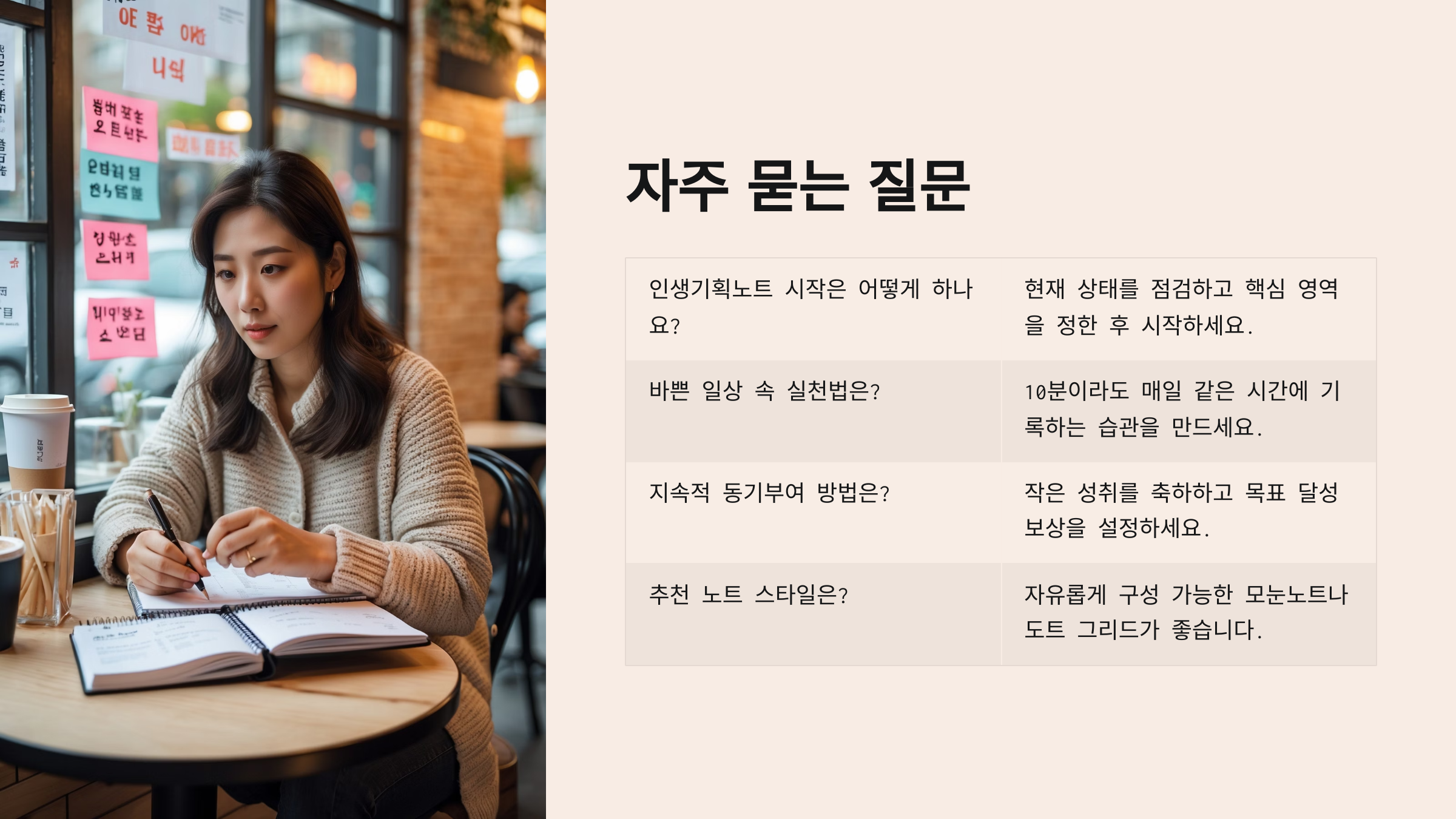 A1. 인생기획노트는 나이에 상관없이 언제든 시작할 수 있어요. 오늘이 가장 빠른 날이니까 바로 시작해보세요! 🚀