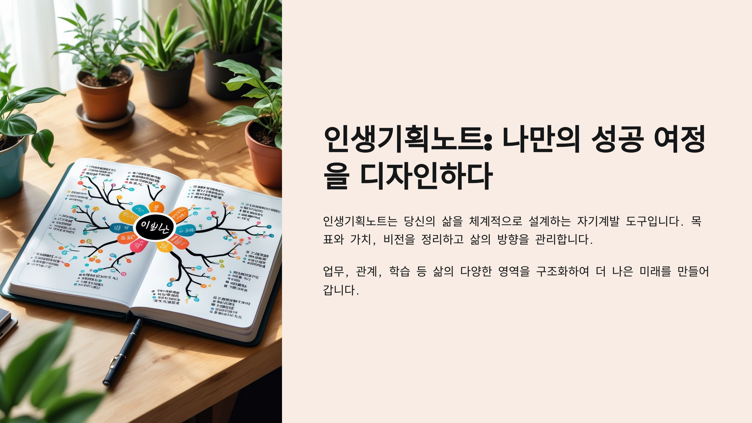 이제 인생기획노트를 활용해, 당신만의 인생 로드맵을 만들어보세요. 자신만의 가치관과 목표를 담아내는 순간, 새로운 가능성이 펼쳐질 거예요!