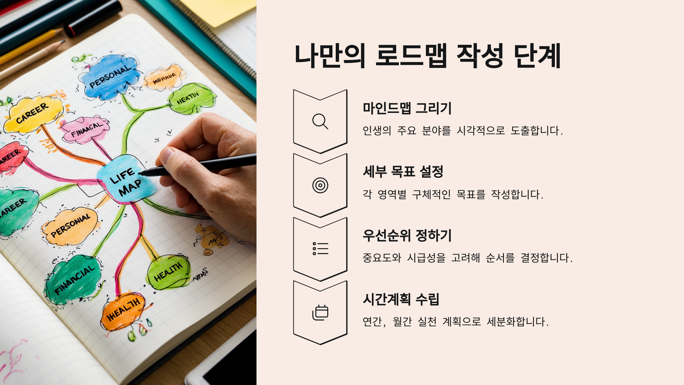 그리고 실천의 비밀은 ‘점검’이에요. 매달이나 분기마다 로드맵을 다시 보면서 “어느 정도 진행됐을까?”를 확인해보세요. 잘 되고 있는 부분은 더 발전시키고, 부족한 부분은 새롭게 계획해보는 거예요. 이렇게 꾸준히 조정하다 보면 목표 달성률이 훨씬 높아져요.