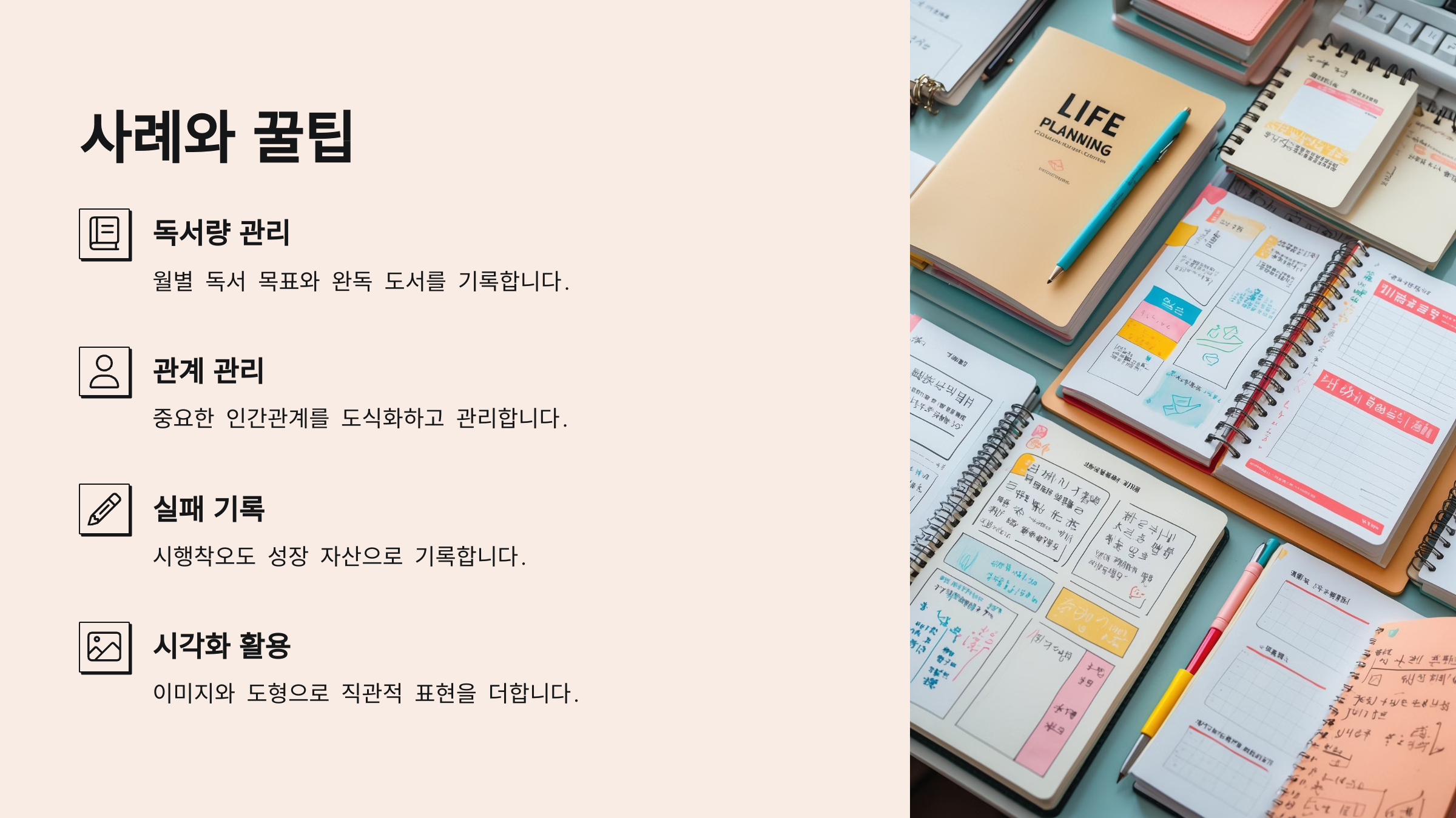 인생기획노트의 중요성은 단순히 ‘목표를 적는다’에서 끝나지 않아요. 나의 생각과 가치관을 구체화하고, 현실적인 계획으로 연결해주는 중요한 역할을 해주죠. 많은 전문가들이 인생기획노트의 필요성을 강조하는 이유는 바로 이 부분에 있어요.