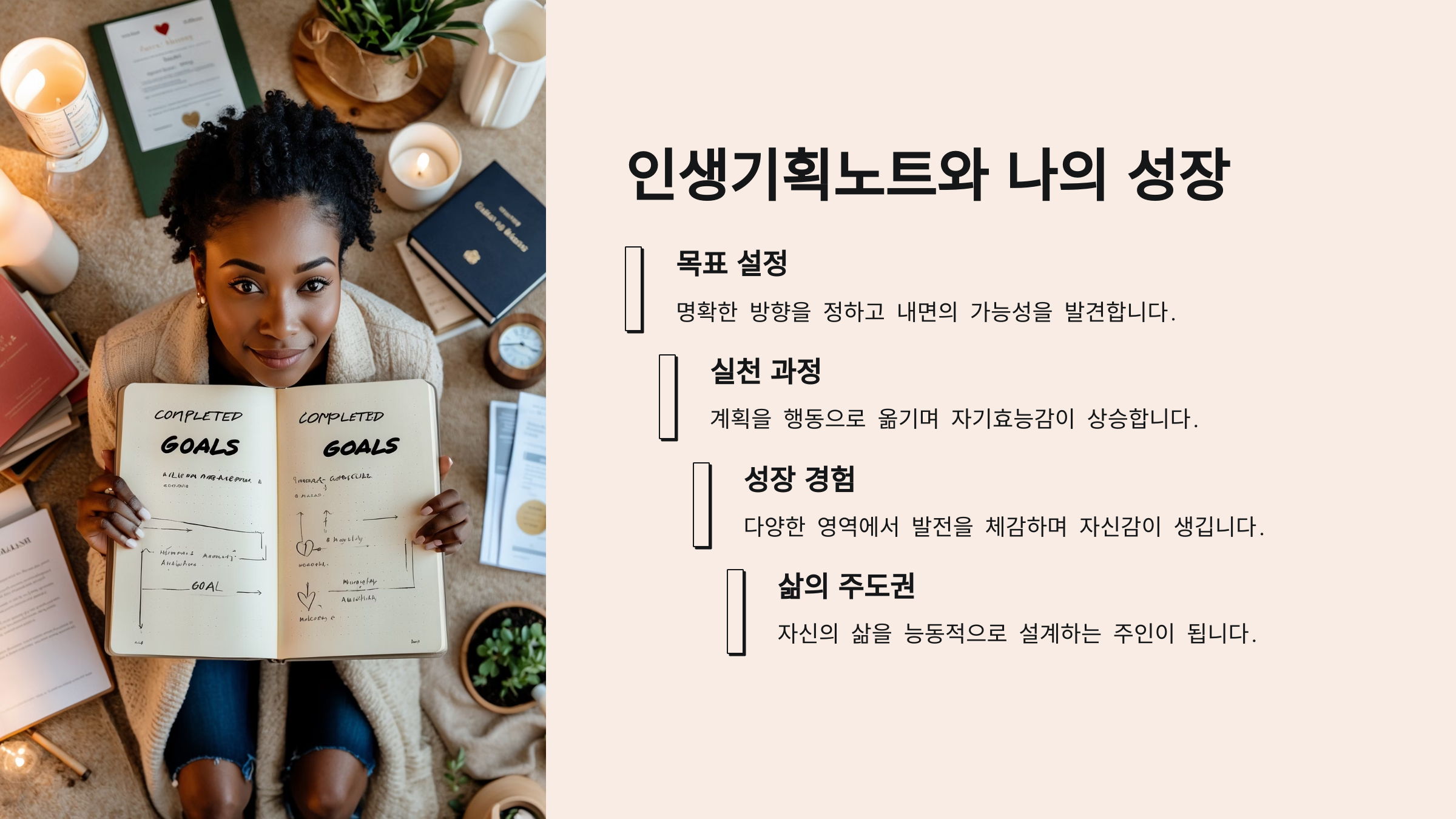 이런 성장 과정을 직접 느껴보는 건 정말 큰 기쁨이에요. 인생기획노트를 쓰면서 ‘나는 충분히 할 수 있어’라는 믿음이 생기고, 그 믿음이 삶을 더 멋지게 만들어줘요.