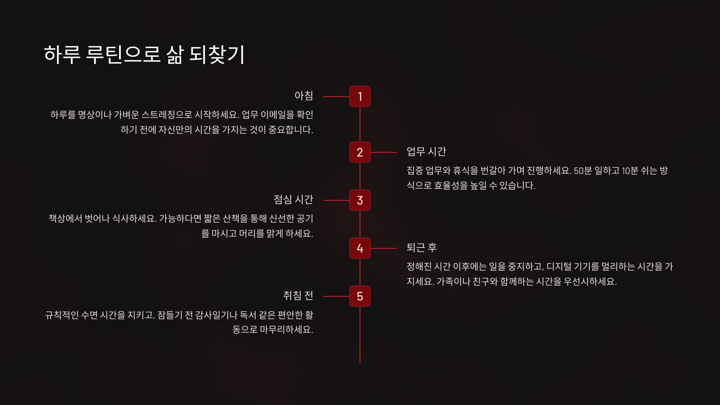 특히 일 중독 성향이 있는 사람은 무계획하게 하루를 흘려보내는 대신, 의도적인 루틴을 만들어야 해요. 하루 종일 ‘일’이 주도하는 삶이 아니라, 내가 주도하는 하루로 전환하는 거예요. 그렇게 하면 일에 쫓기지 않고, 일과 삶 사이의 건강한 경계를 세울 수 있어요.