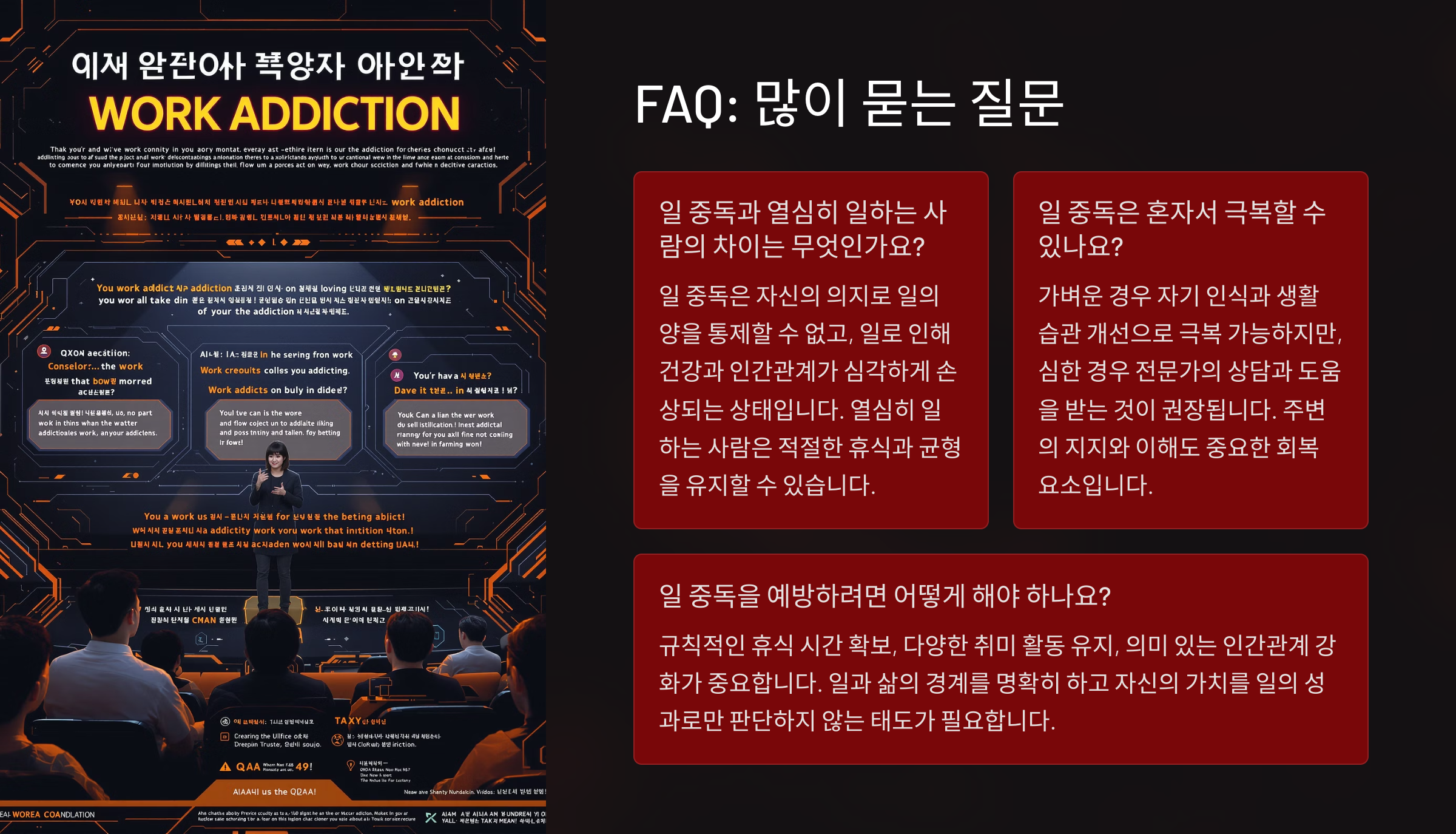 A1. 공식적인 정신질환으로 분류되진 않지만, 심각한 심리적·신체적 영향을 주기 때문에 치료와 관리가 필요해요. WHO도 과로사를 공인된 위험 요소로 인정했답니다.