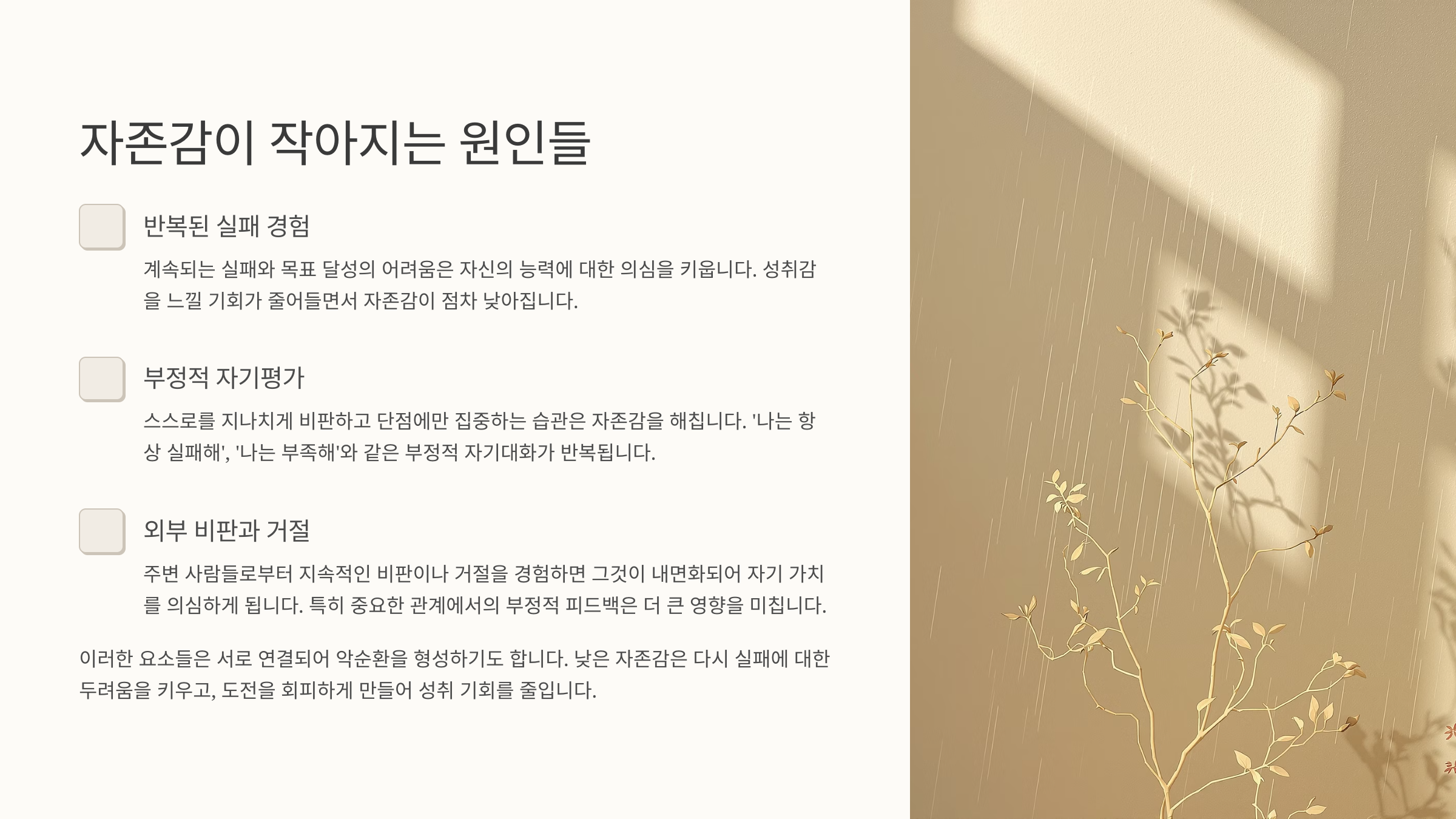 자존감이 낮아지는 이유는 단순히 "내가 못났기 때문"이 아니에요. 오히려 자존감을 낮추는 환경적, 심리적 요인이 복합적으로 작용하기 때문이에요. 특히 반복적인 실패 경험, 비판적인 피드백, 그리고 과도한 기대는 자존감을 갉아먹는 주된 요인이 될 수 있어요.