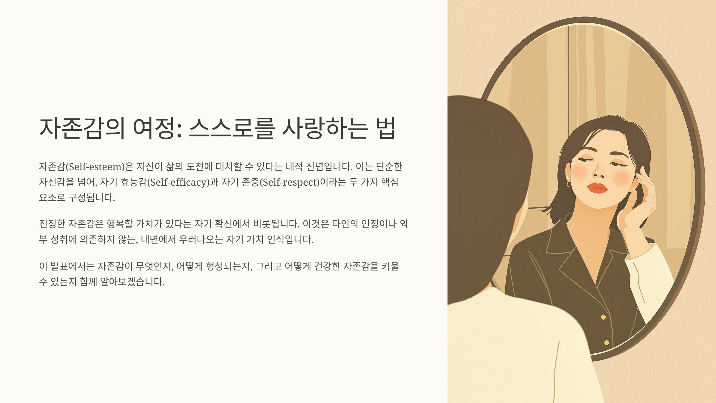 자존감은 ‘나 자신을 얼마나 소중히 여기는가’에 대한 감정이에요. 이는 단순히 자신을 사랑하는 것만을 의미하진 않아요. 나의 장점과 단점을 있는 그대로 인식하고, 그럼에도 나를 존중할 수 있는 힘을 말하죠.