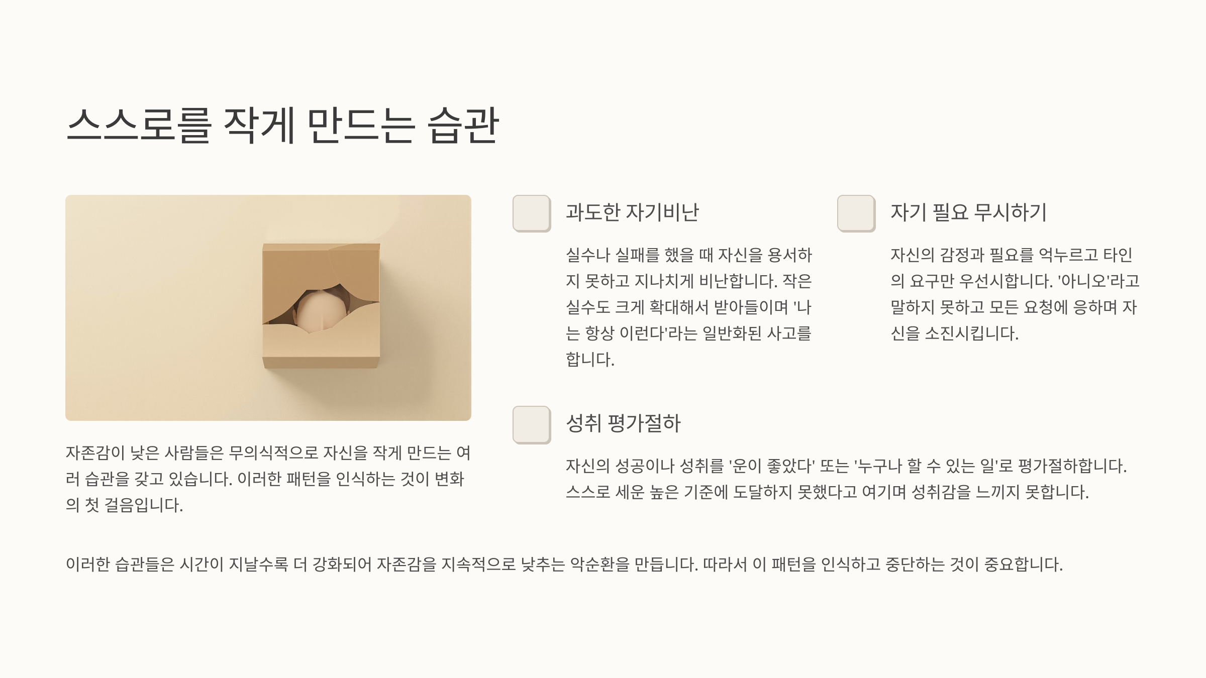 그럼 이제, 우리가 스스로 자존감을 깎고 있는 습관에는 뭐가 있는지 살펴볼 차례예요. 알고 보면 자주 하는 말과 행동이 문제일 수 있어요! 🌀
