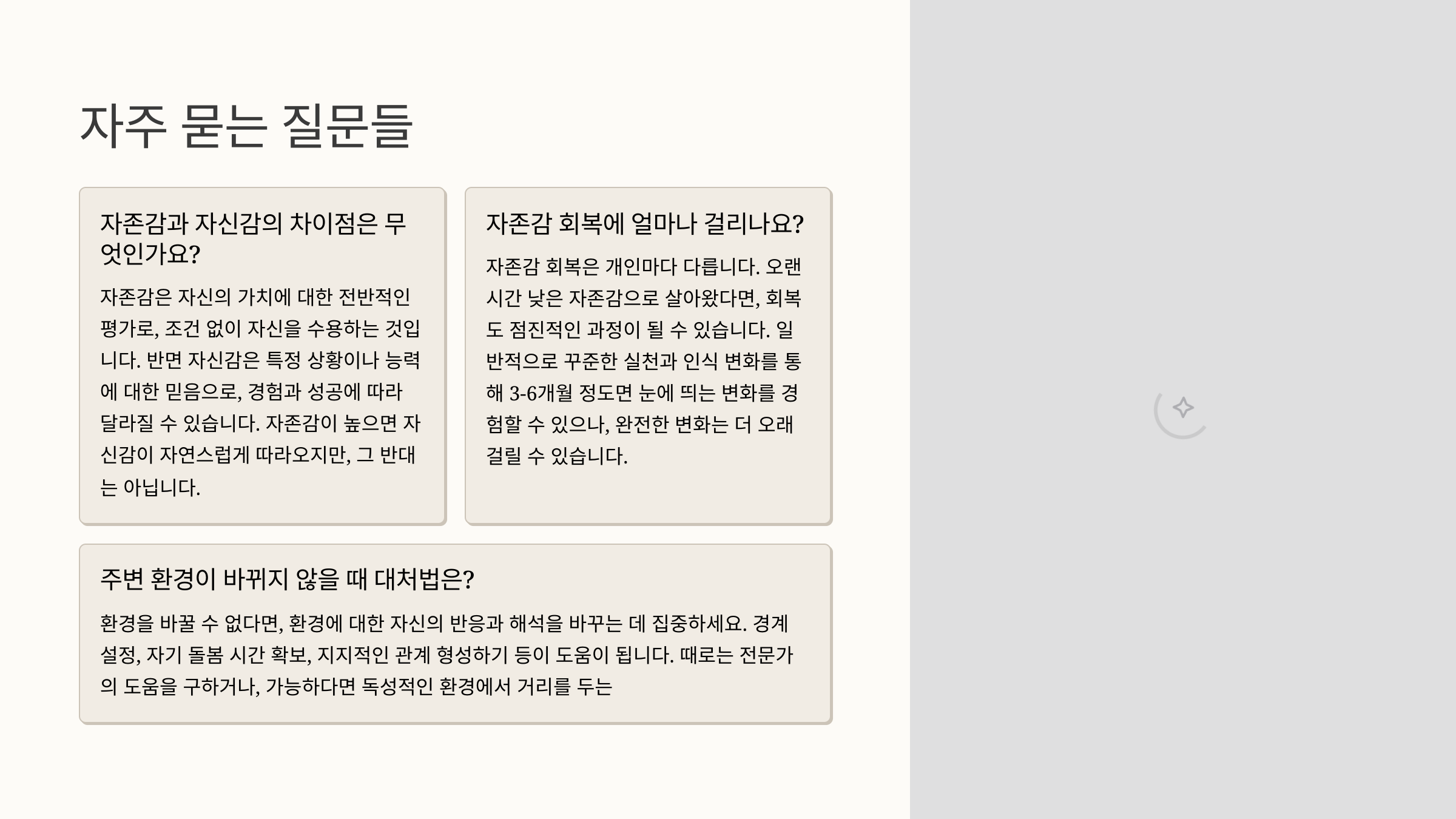 자존감을 회복하는 데는 시간과 노력이 필요하지만, 분명히 가능해요. 가장 중요한 건, ‘지금의 나도 괜찮다’는 걸 받아들이는 거예요. 그 위에 조금씩 자신감을 쌓아가면 돼요.