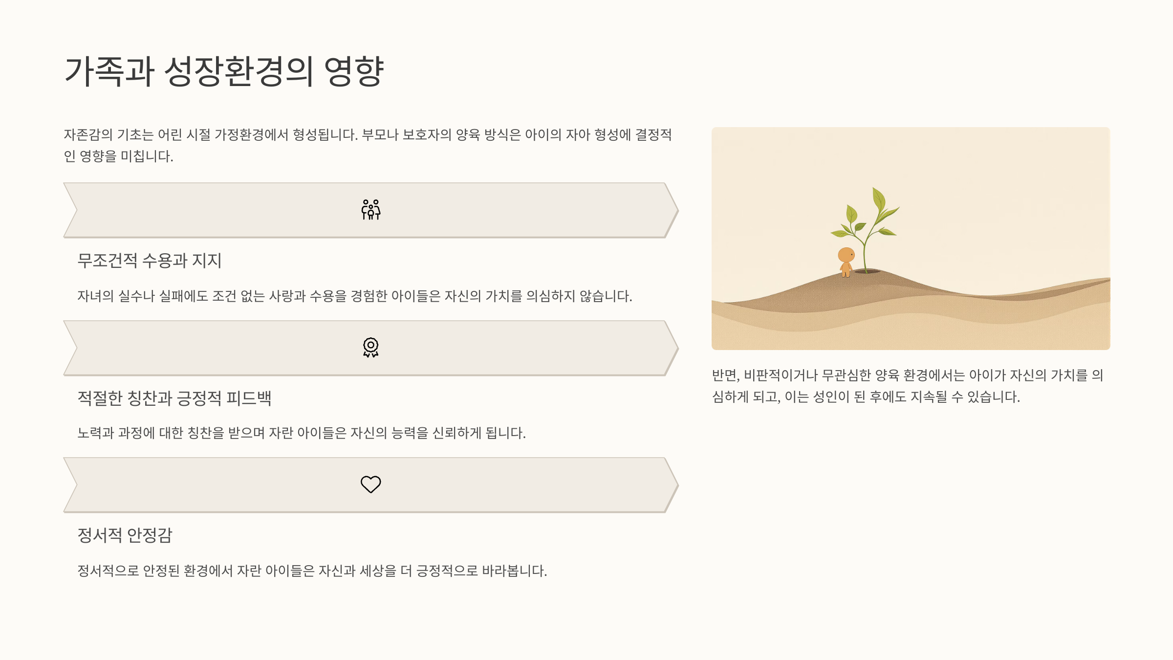 어릴 때부터 자존감이 어떻게 형성되는지 이해하면, 왜 나는 작아진다고 느끼는지를 파악하는 데 큰 도움이 될 거예요.