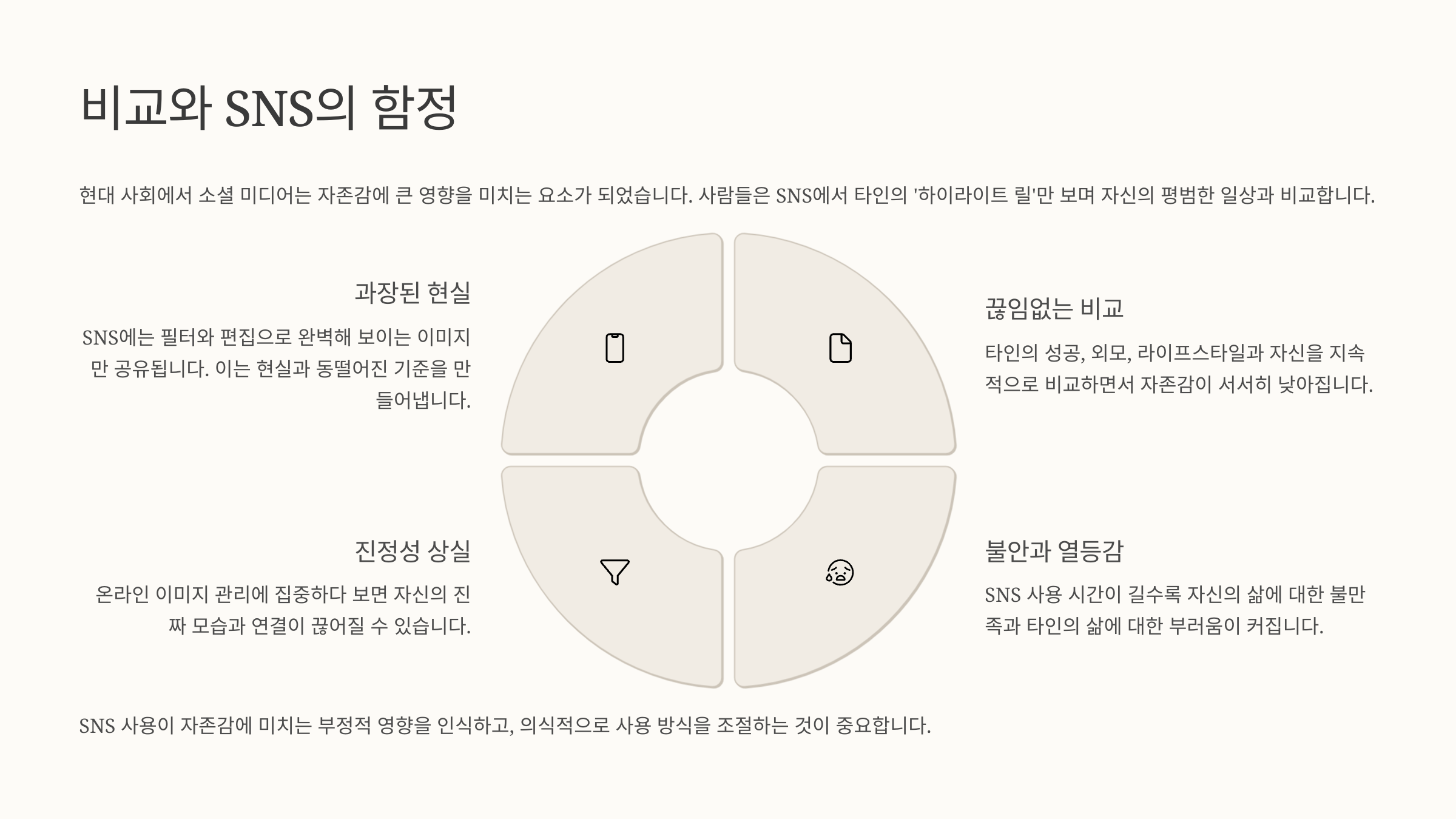 | 사회적 비교 | 남과 비교하며 자신의 가치를 평가하게 돼요. |