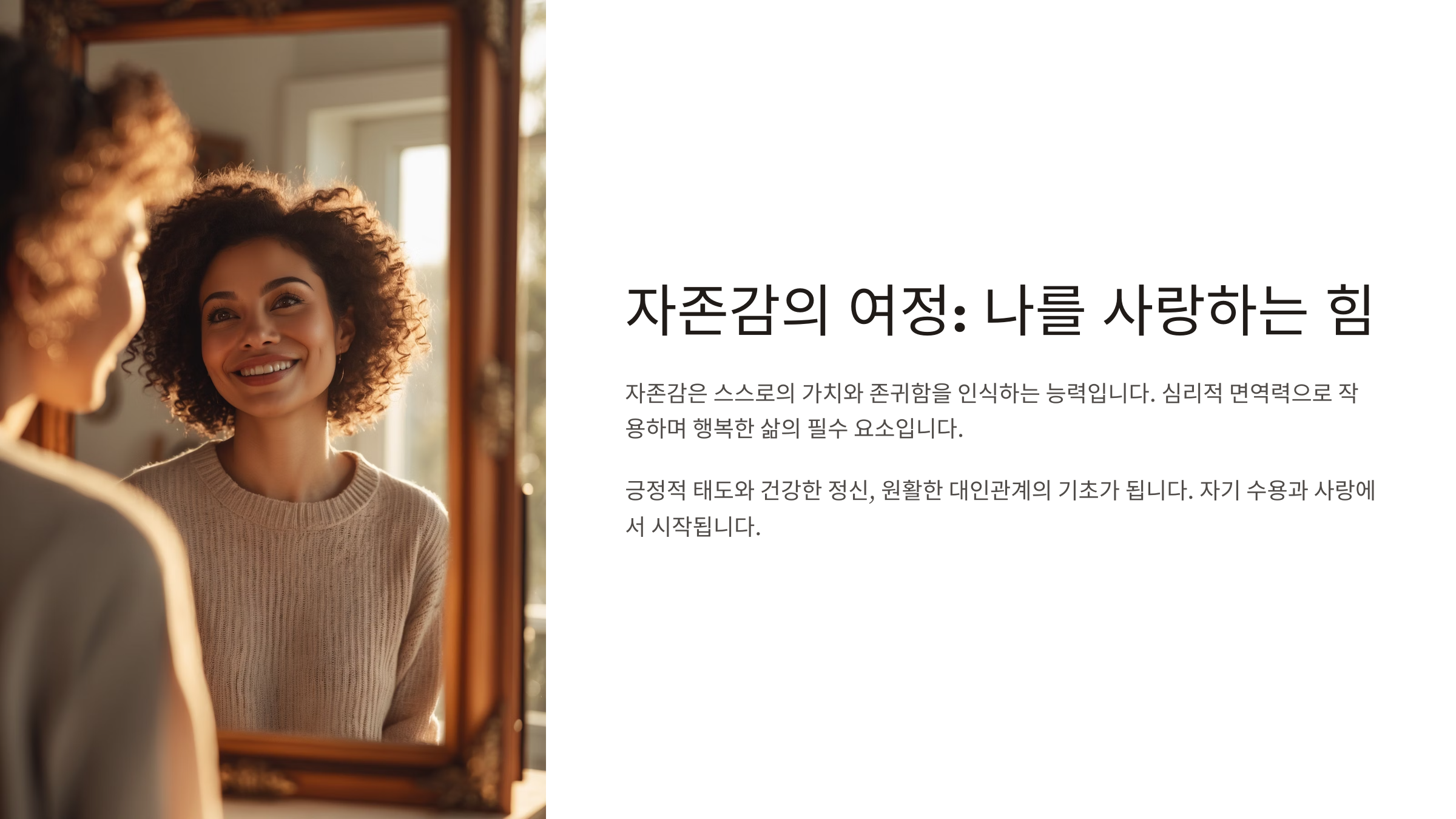 반대로 자존감이 낮아지면 매사에 자신이 없고, 남의 시선에 휘둘리게 되죠. 그래서 자존감은 행복의 열쇠이자, 삶의 질을 좌우하는 중요한 요소랍니다.