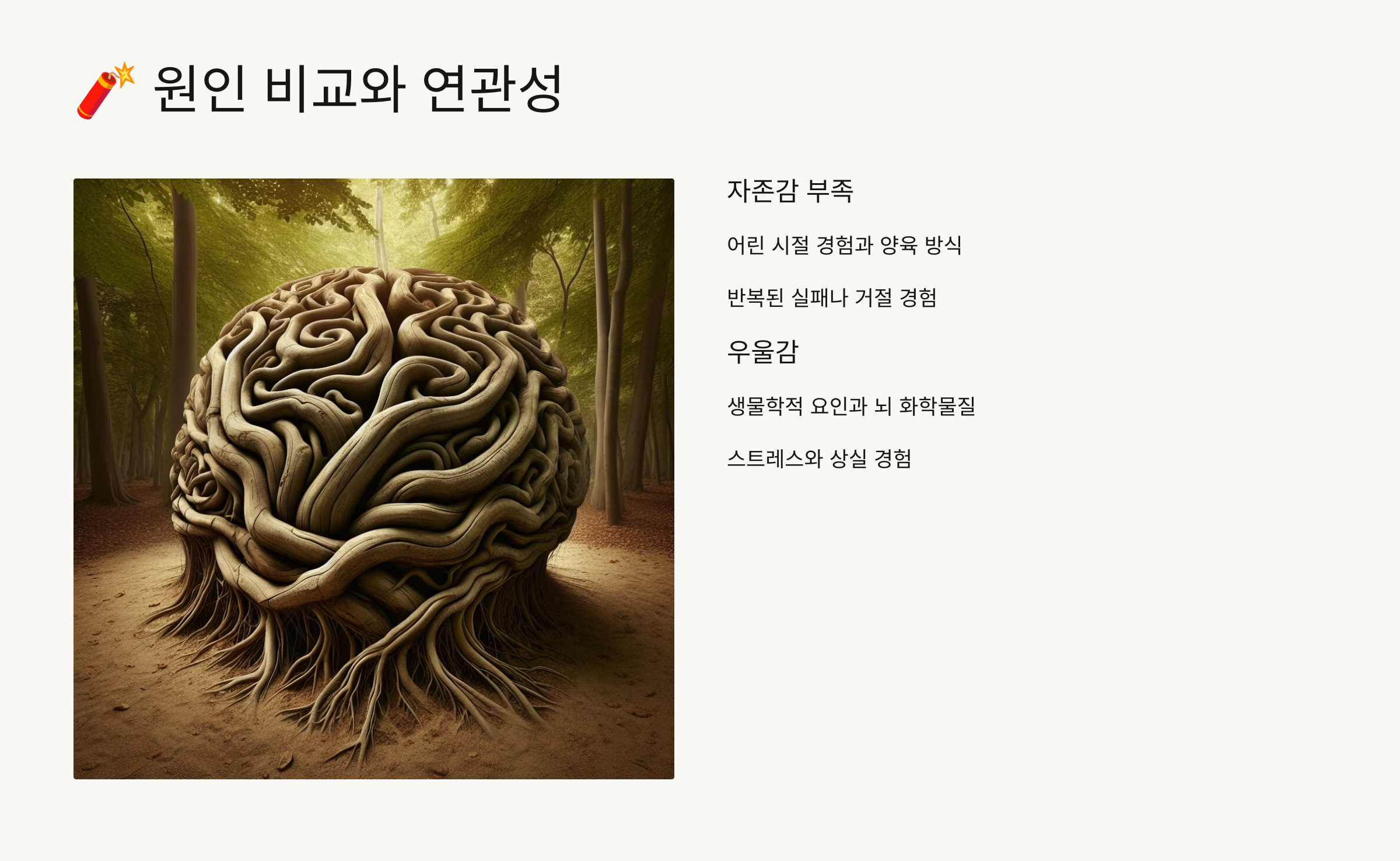자존감 부족과 우울감은 서로 다른 기원을 가지고 있어요. 하지만 많은 경우 두 가지가 서로 얽히며 복합적인 심리 문제를 만들기도 해요. 자존감 부족은 대개 성장 환경, 부모와의 관계, 반복된 실패 경험 등 ‘관계 기반’에서 시작돼요.