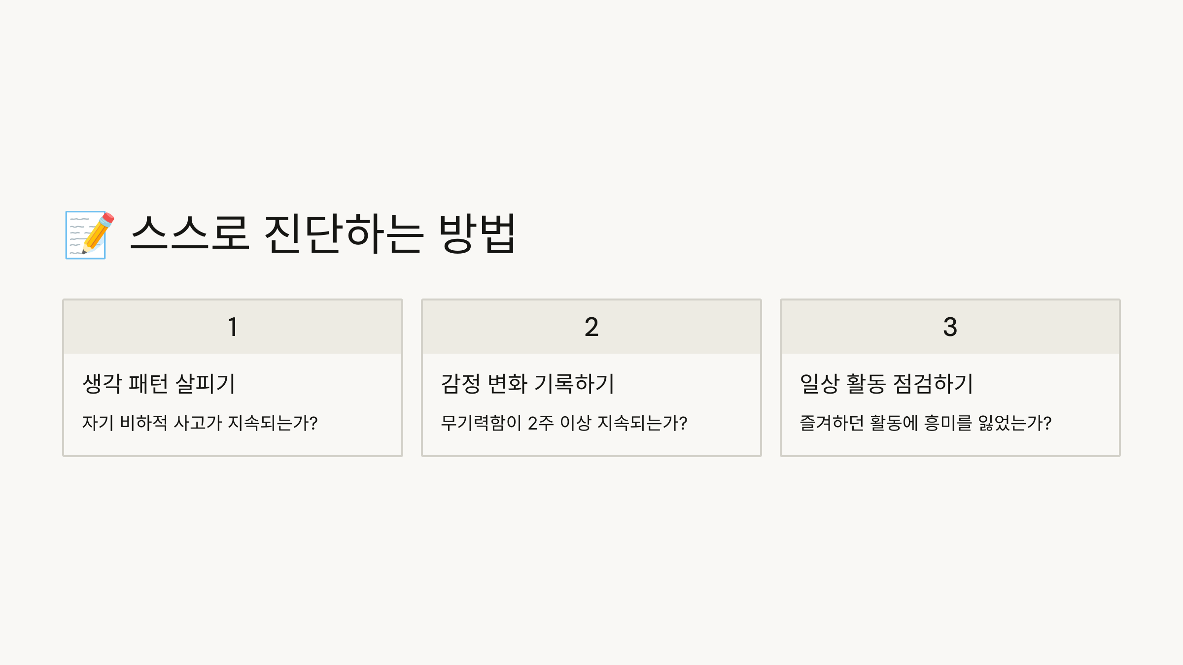 📊 스스로의 상태를 체크하고, 필요한 경우엔 전문가에게 연결해주는 것도 자기 돌봄이에요.