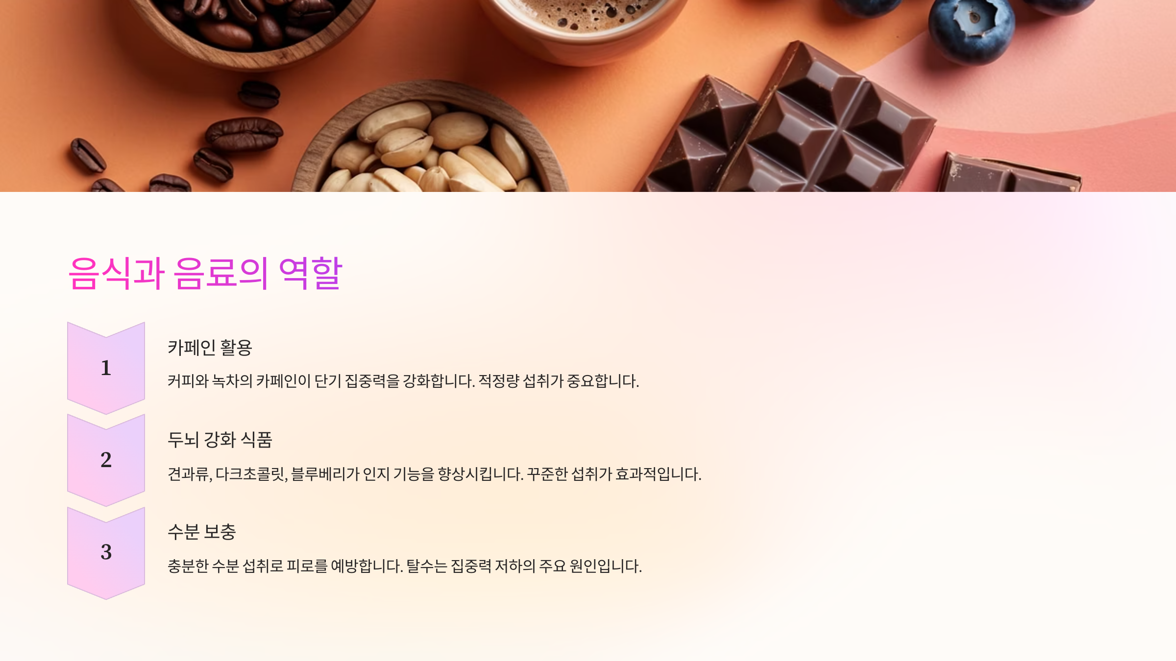 집중력을 높이는 데 음식과 음료도 큰 역할을 해요. 특히 물은 몸의 70%를 차지하기 때문에 수분이 부족하면 머리가 멍해질 수 있어요. 🥤