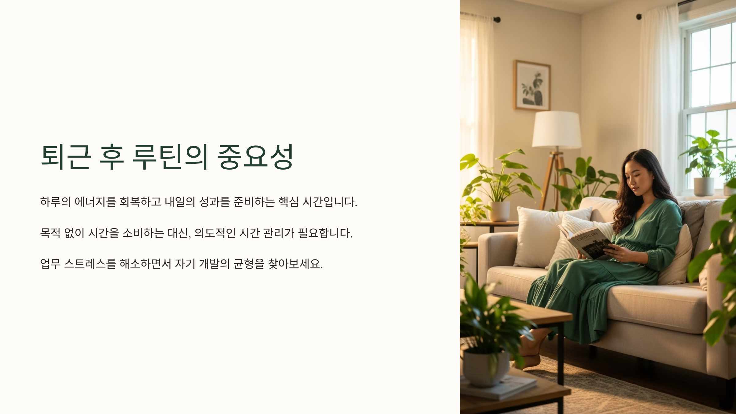 사실 모두가 똑같은 루틴을 가질 필요는 없어요. 중요한 건 나에게 맞는 방식으로 퇴근 후의 시간을 조율해나가는 거예요.