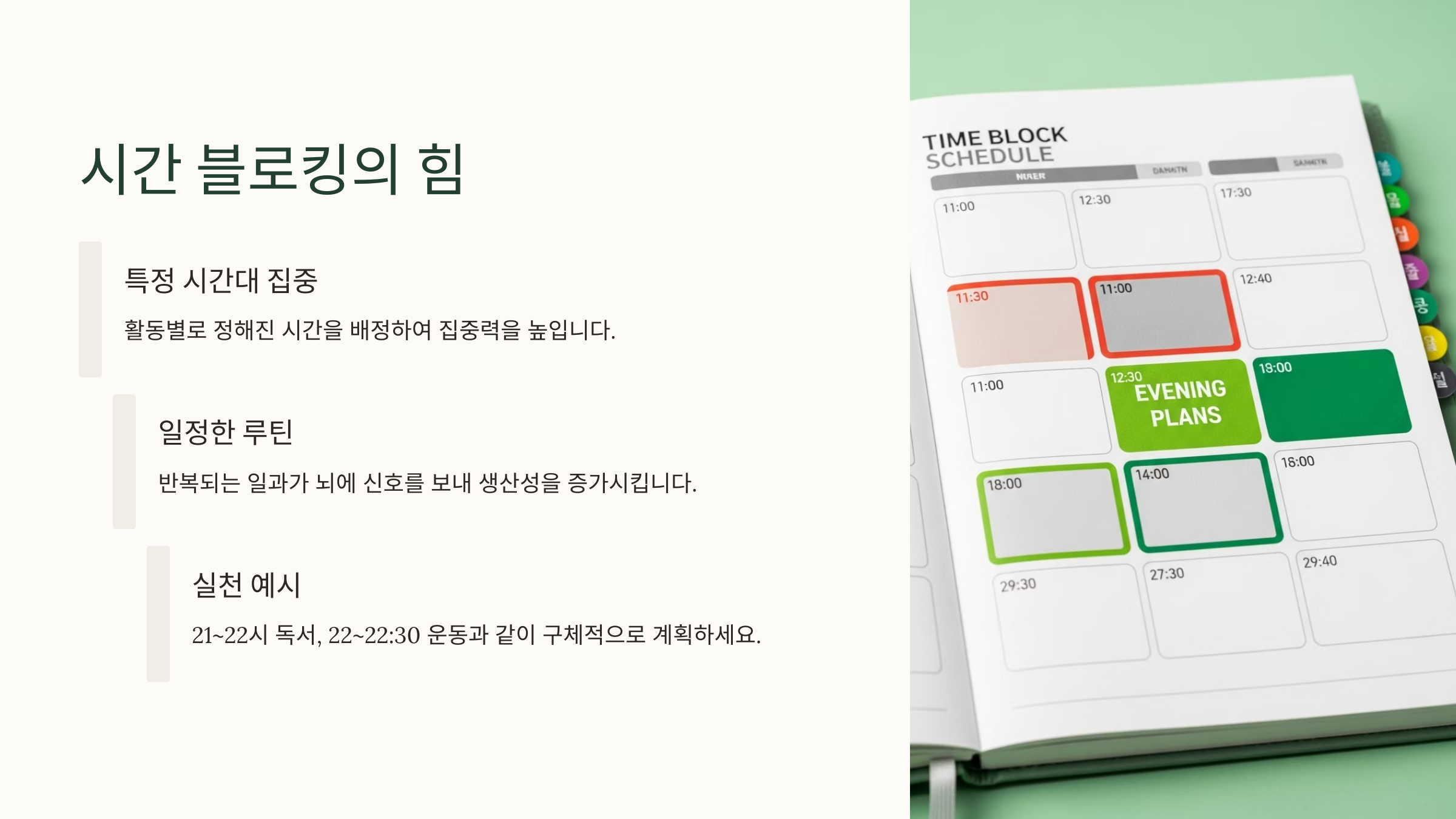 시간 블로킹의 핵심은 ‘해야 할 일’이 아니라 ‘언제 할 것인가’를 정하는 데 있어요. 이 방식은 퇴근 후의 산만한 환경 속에서도 집중을 가능하게 해주는 마법 같은 기술이에요.